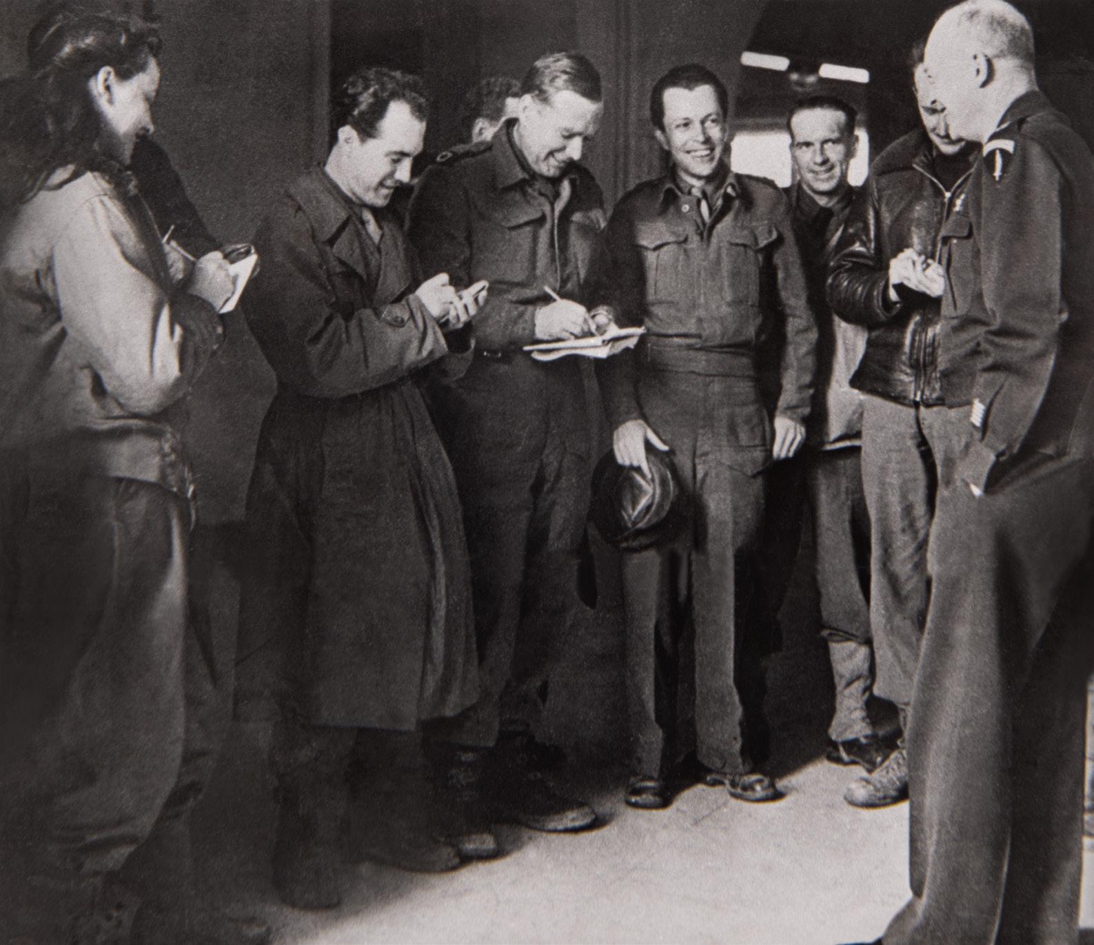(Above) News reporter Stringer stands among a half-circle of men for an impromptu interview with Gen. Dwight D. Eisenhower, the supreme commander of the Allied forces in Europe and leader of the Normandy invasion.