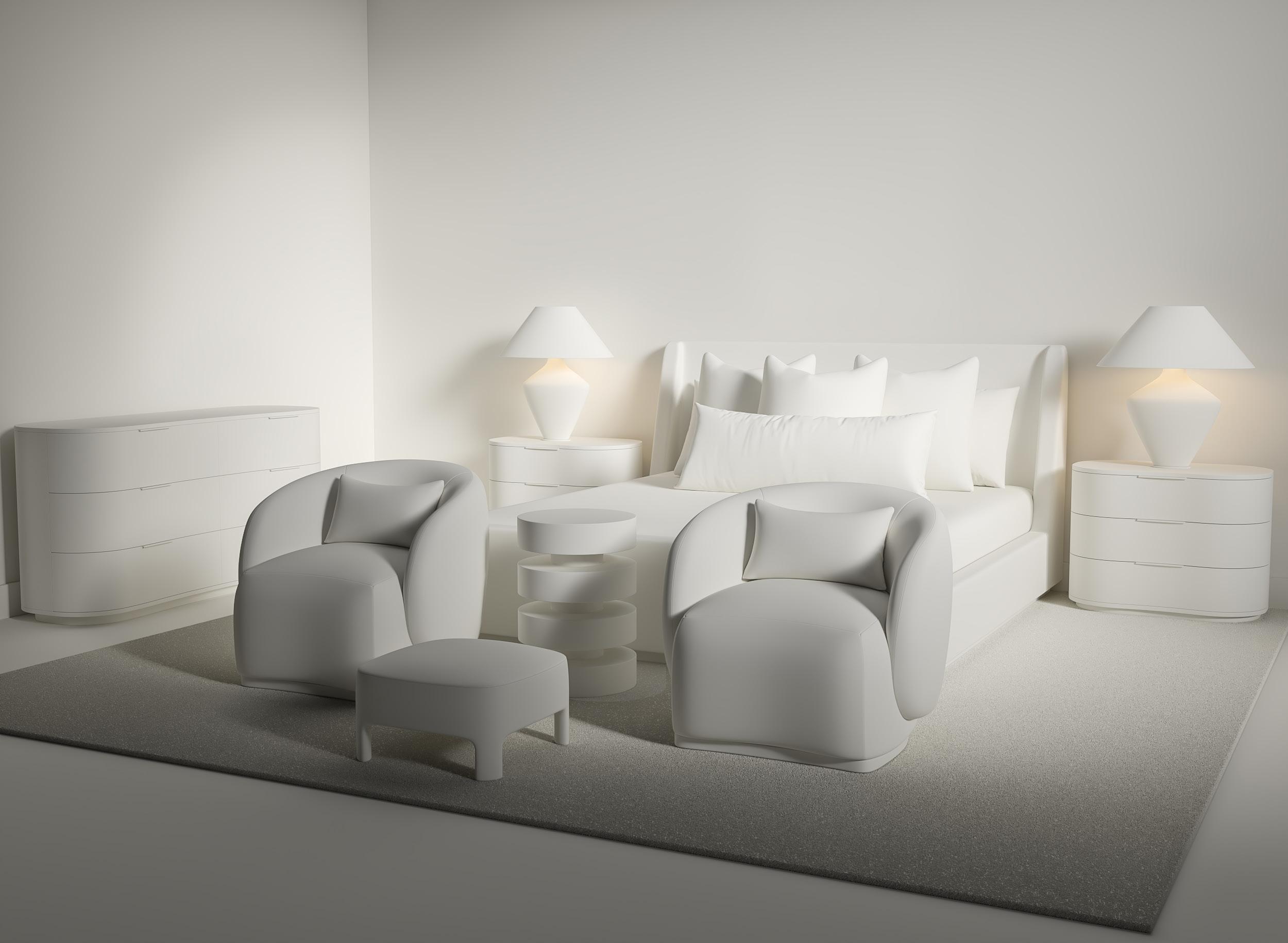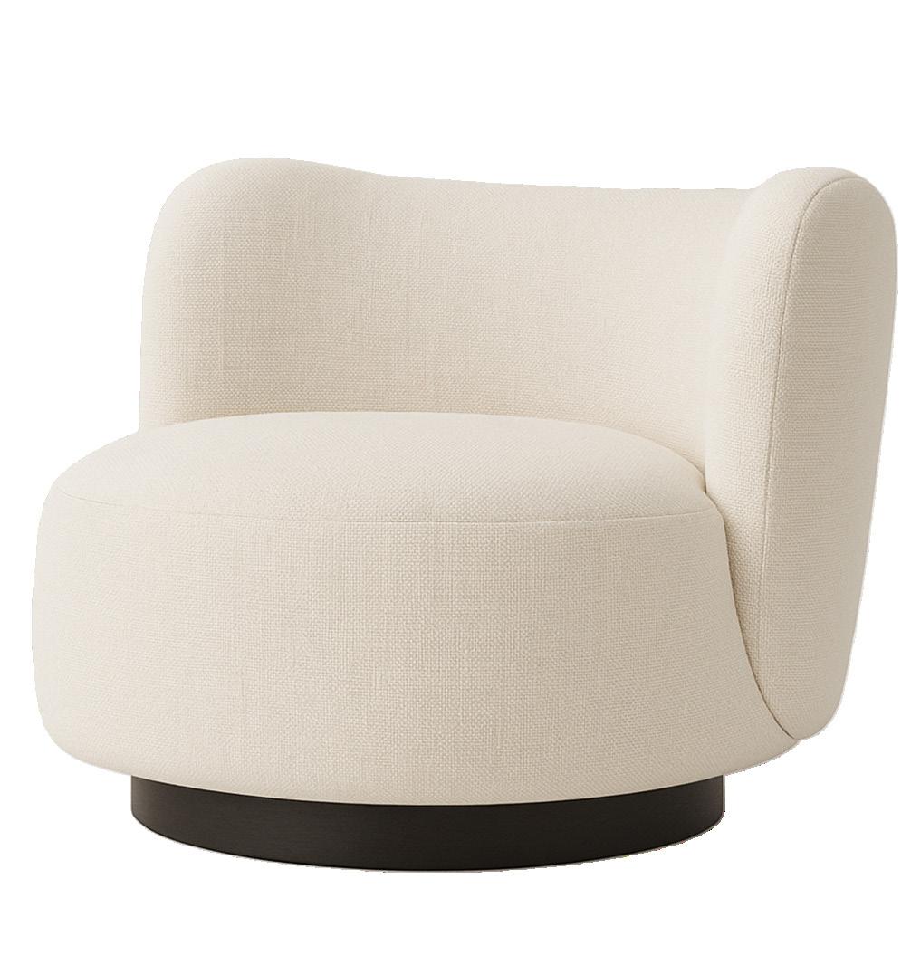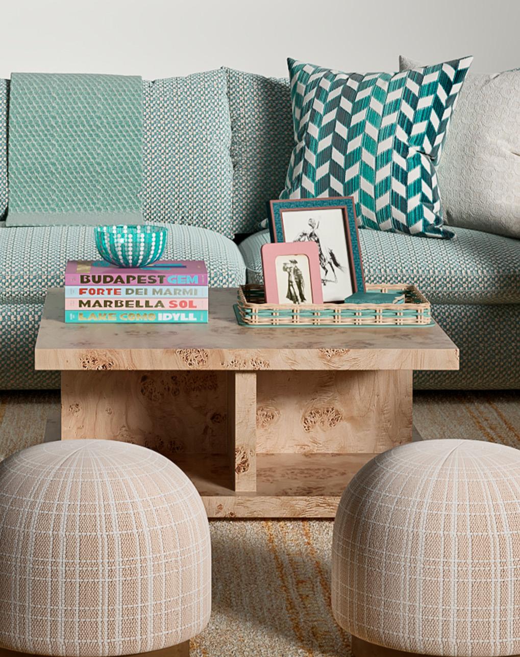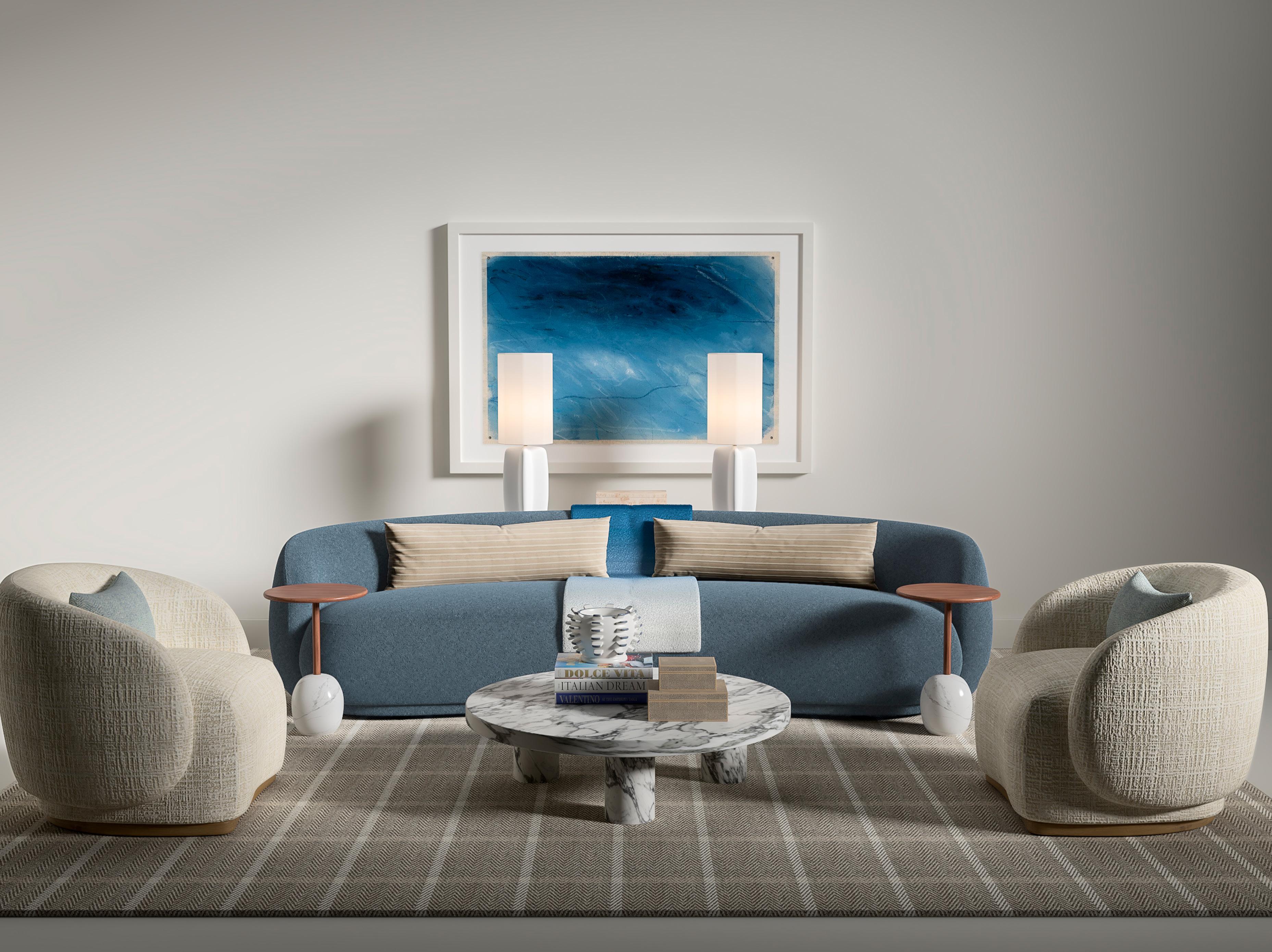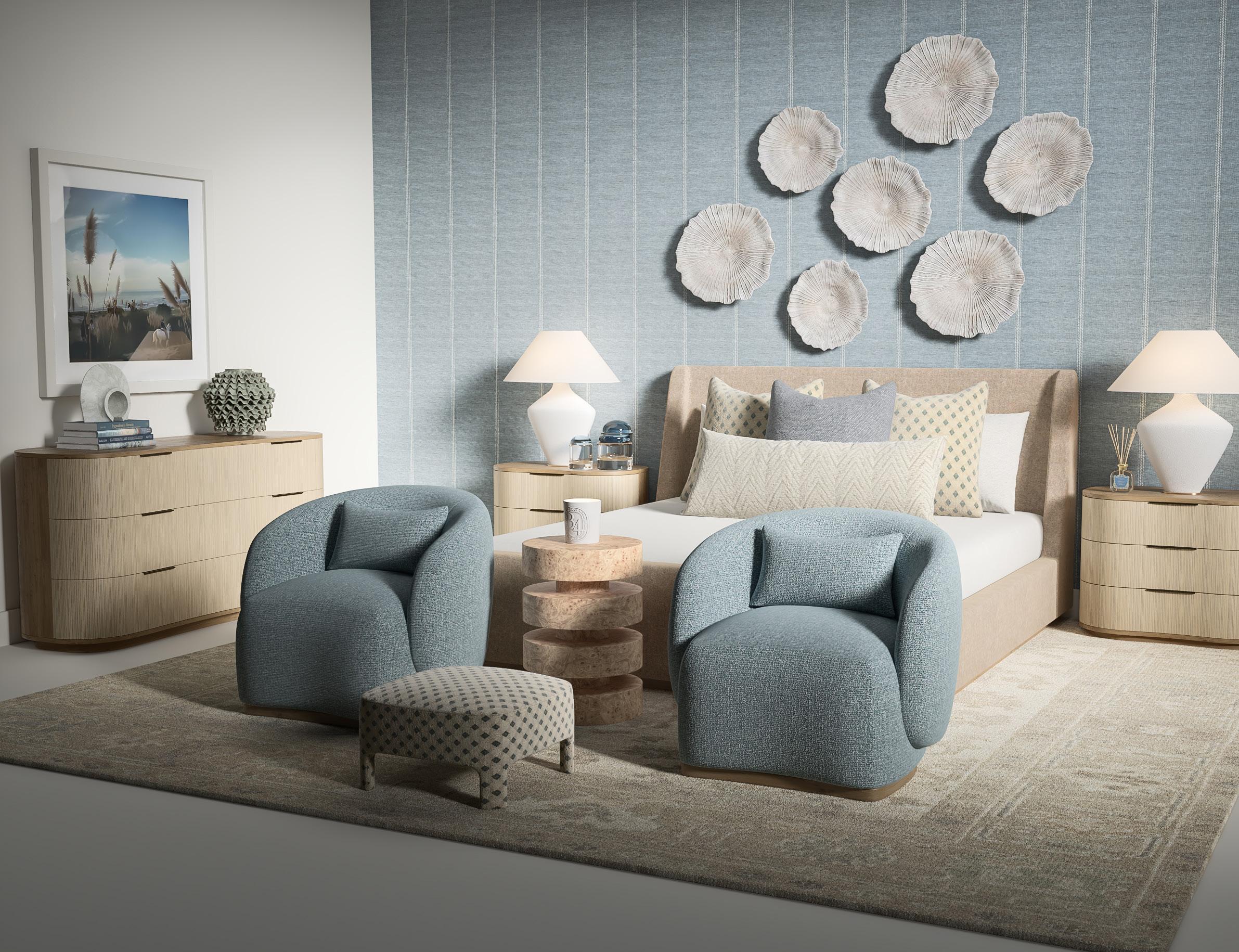 Soft, rounded corners and organic shapes in light wood and woven tones bring a relaxed elegance, while marble accents add a touch of sophistication. The upholstery is customizable in four fabrics, which can be mixed and matched throughout all the pieces in the room.