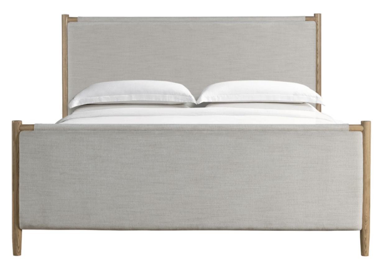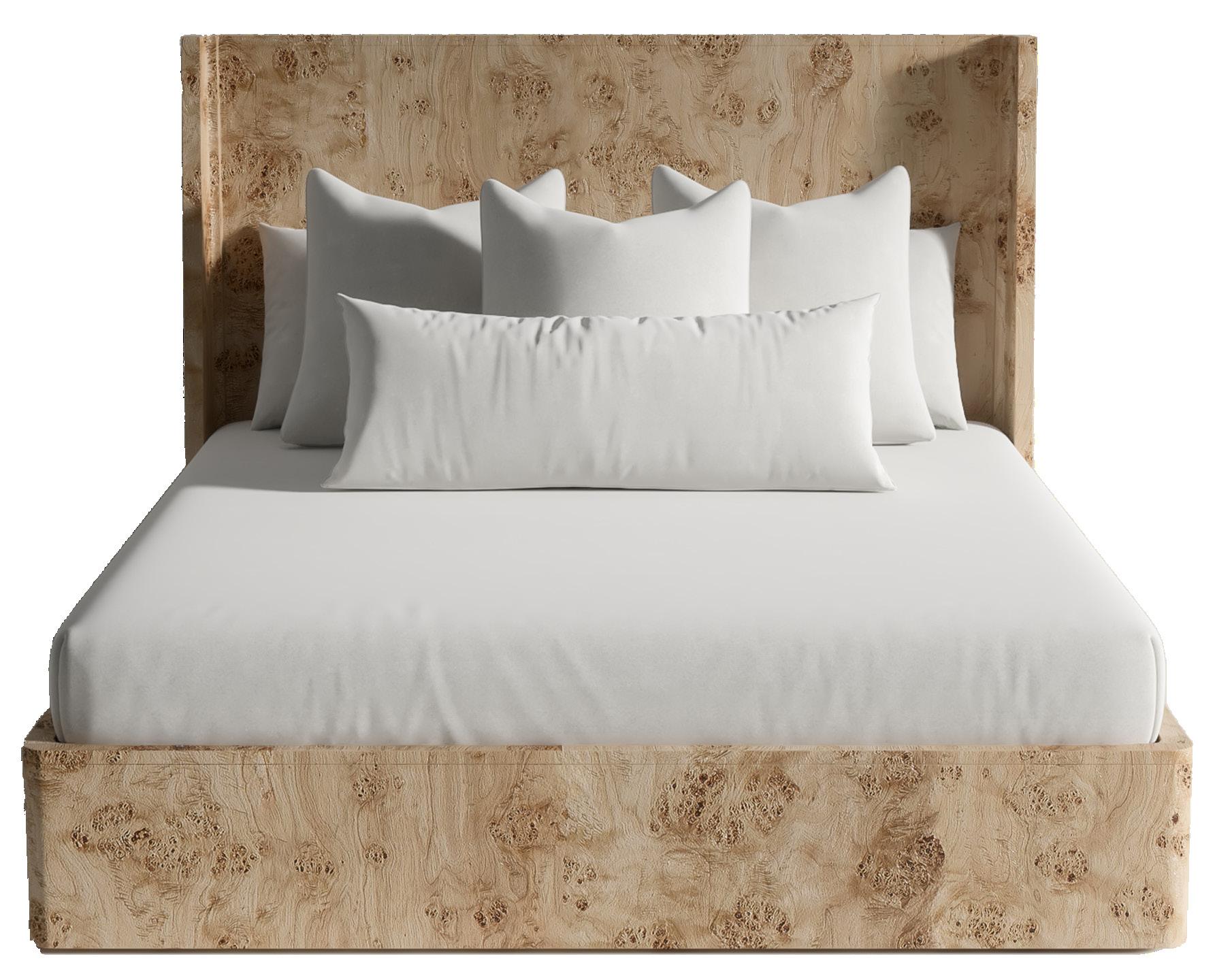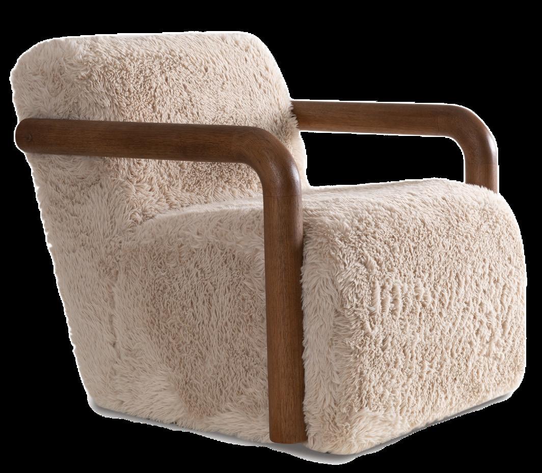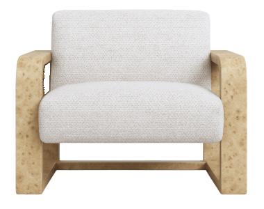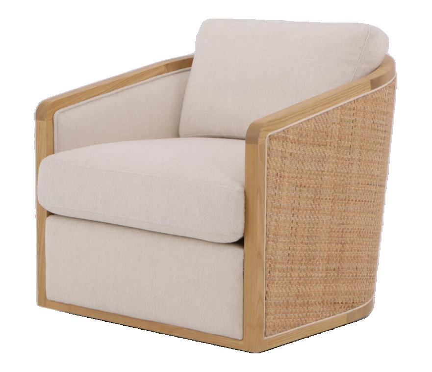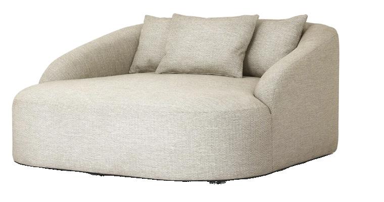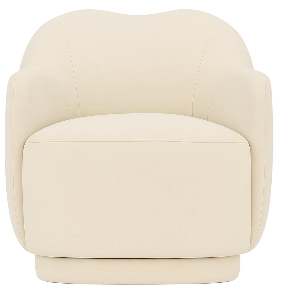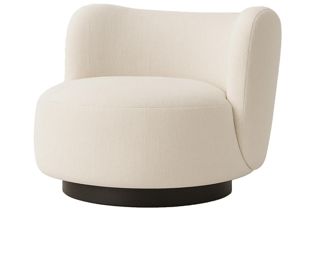 Soft, rounded corners and organic shapes in light wood and woven tones bring a relaxed elegance, while marble accents add a touch of sophistication. The upholstery is customizable in four fabrics, which can be mixed and matched throughout all the pieces in the room.