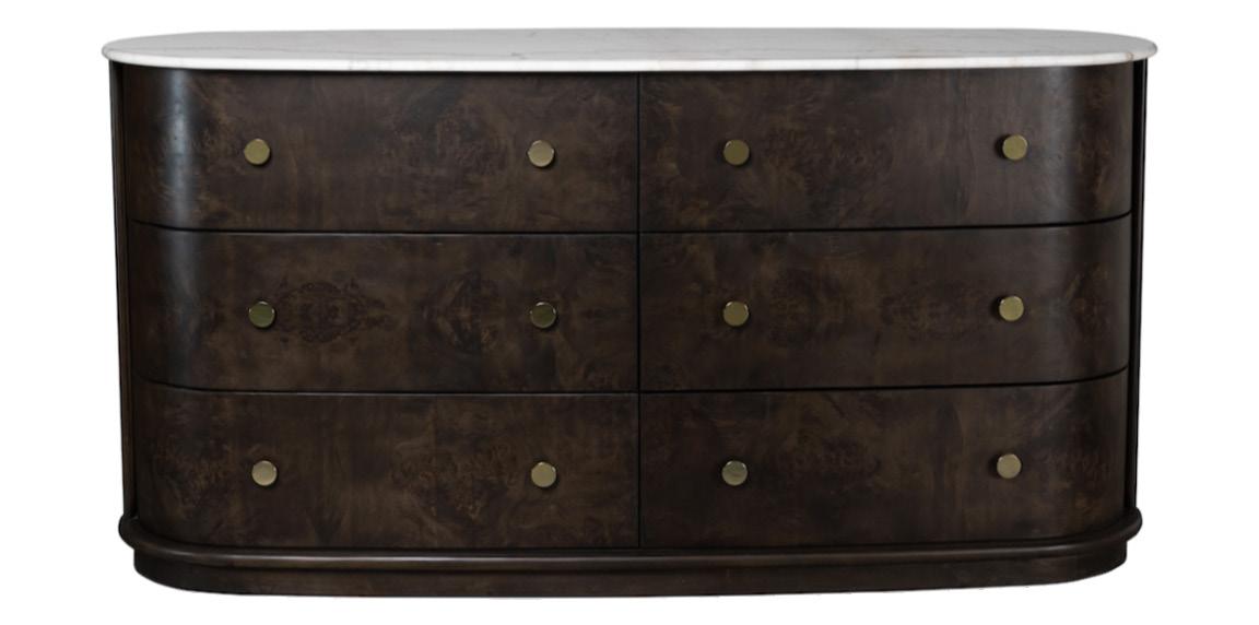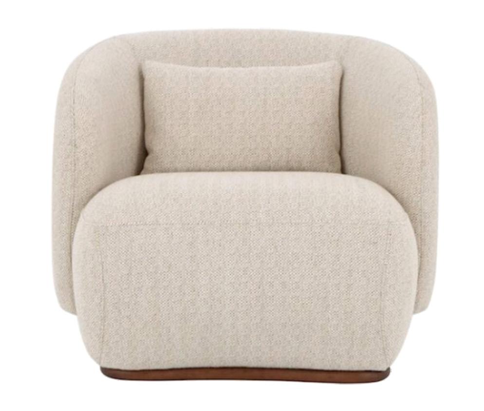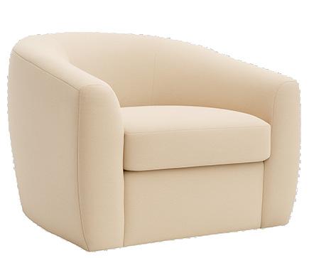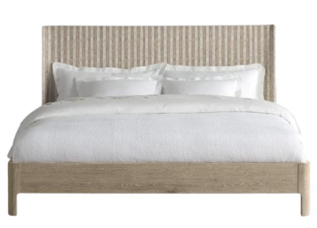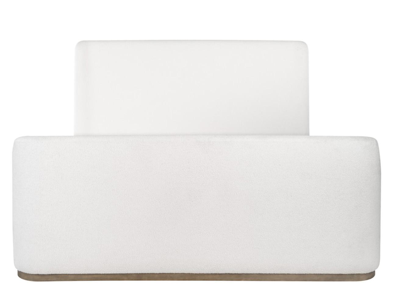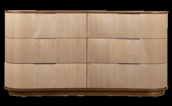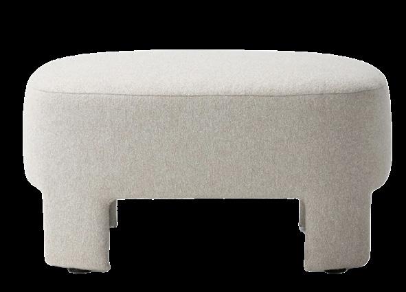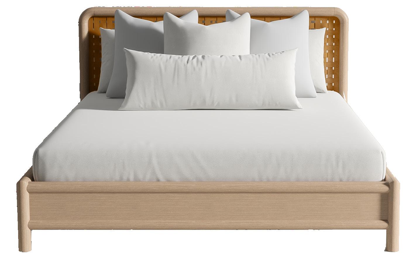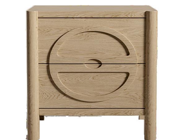 Soft, rounded corners and organic shapes in light wood and woven tones bring a relaxed elegance, while marble accents add a touch of sophistication. The upholstery is customizable in four fabrics, which can be mixed and matched throughout all the pieces in the room.