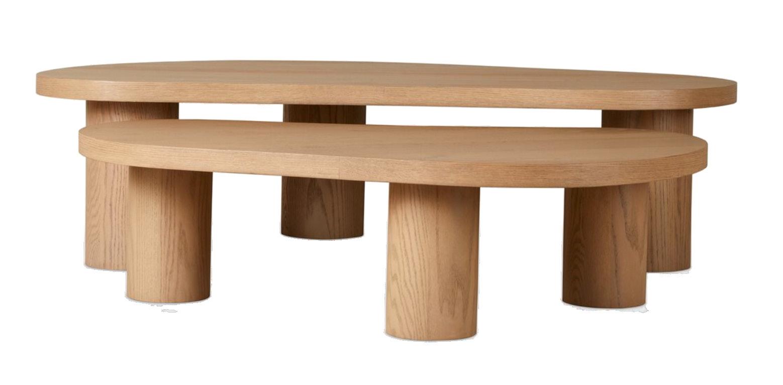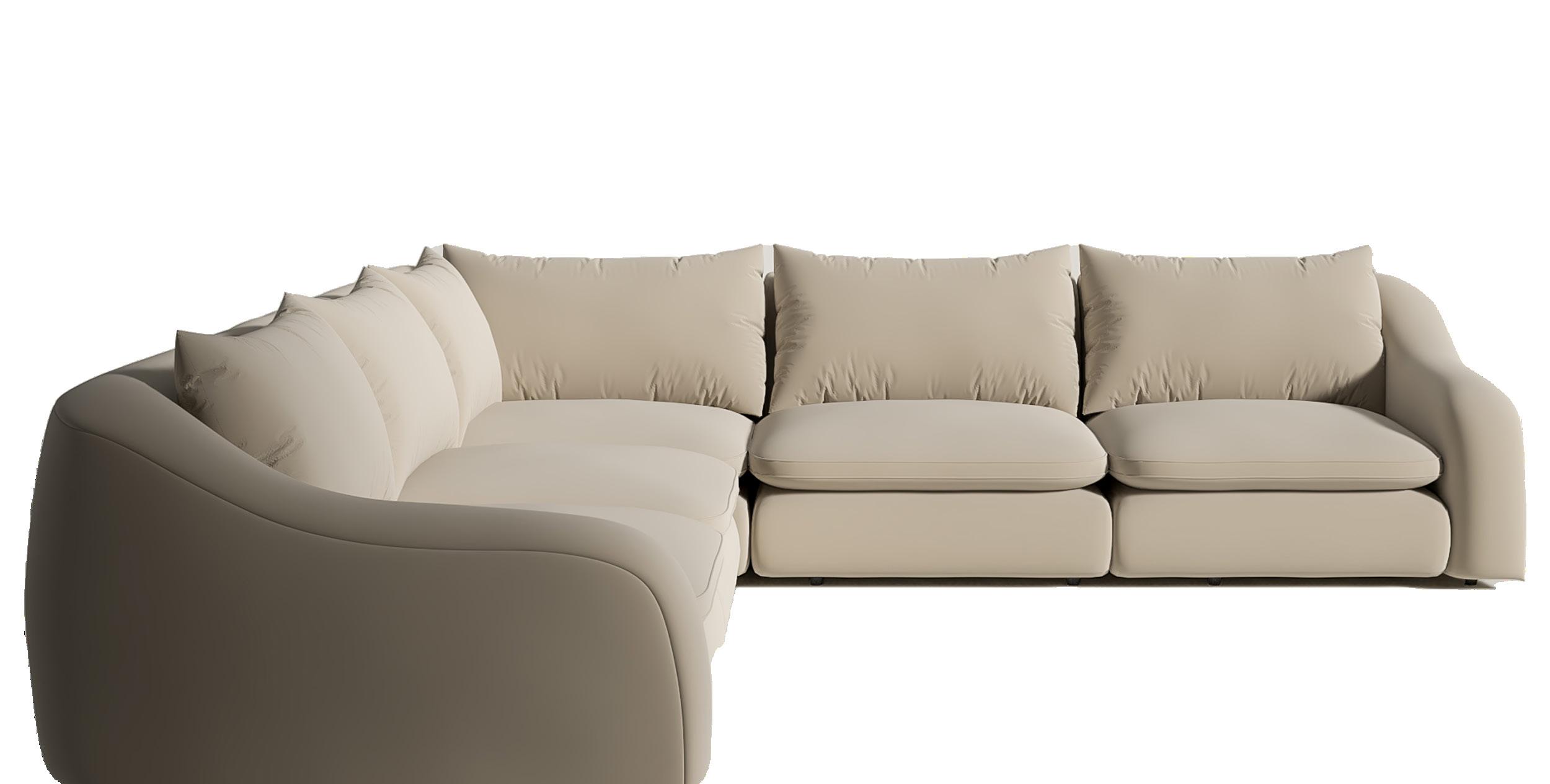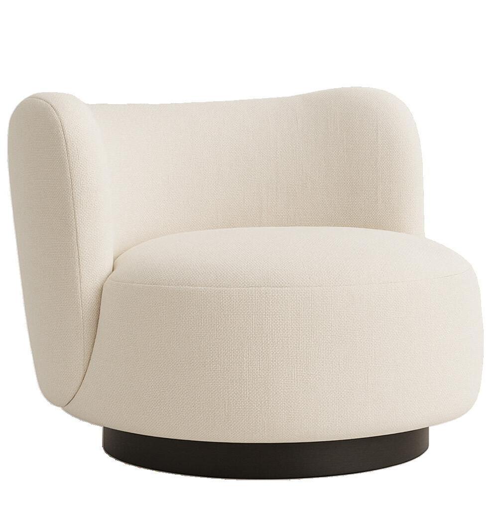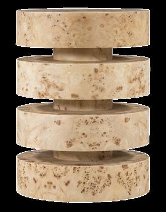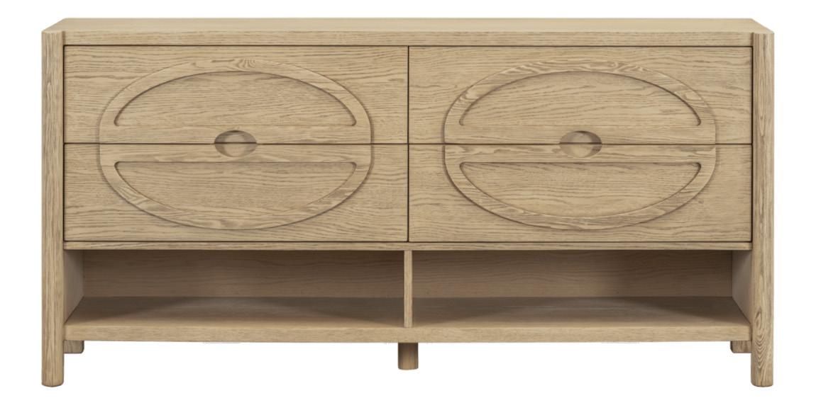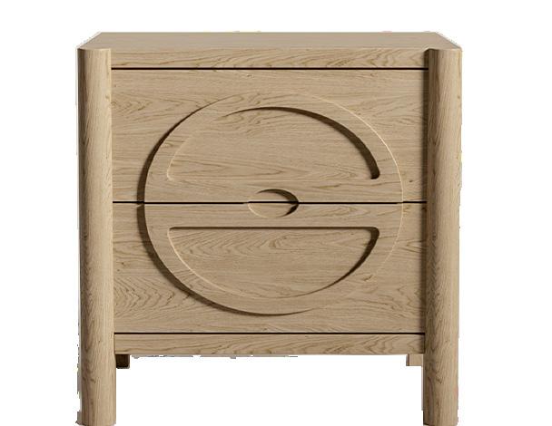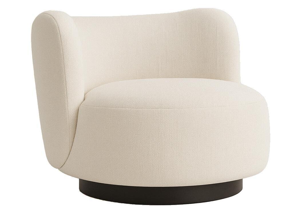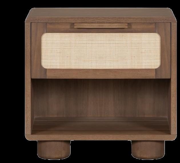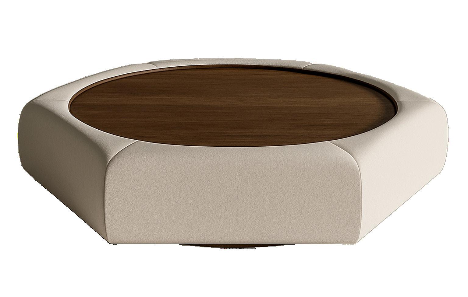 Soft, rounded corners and organic shapes in light wood and woven tones bring a relaxed elegance, while marble accents add a touch of sophistication. The upholstery is customizable in four fabrics, which can be mixed and matched throughout all the pieces in the room.