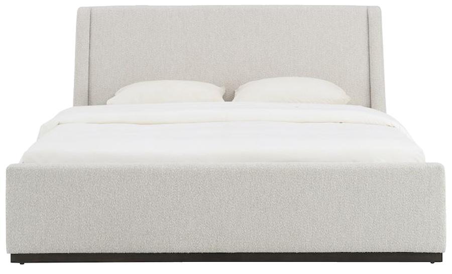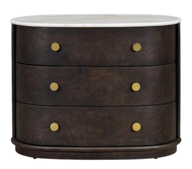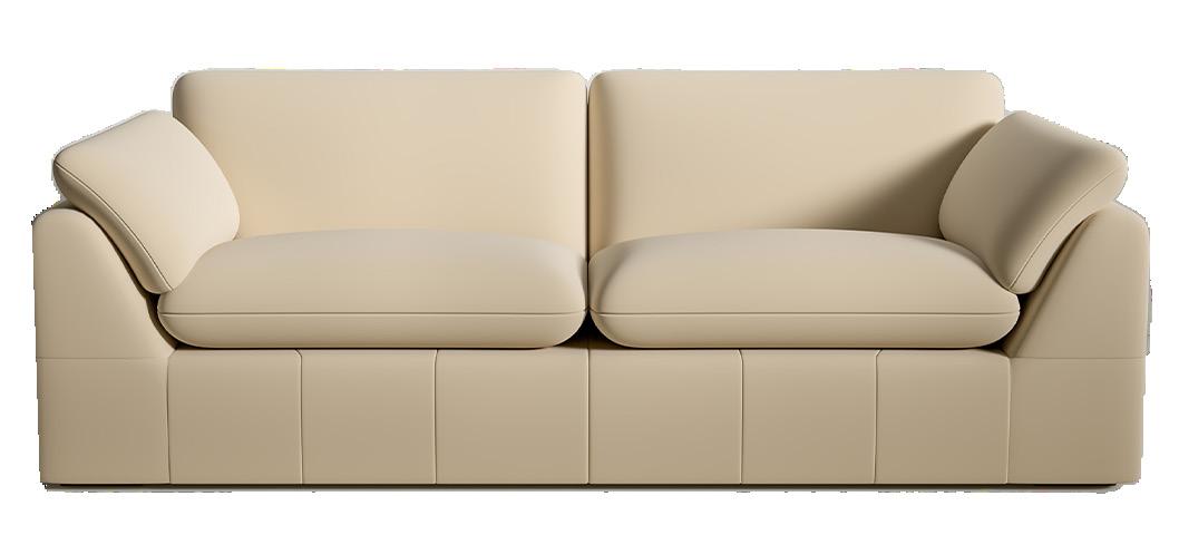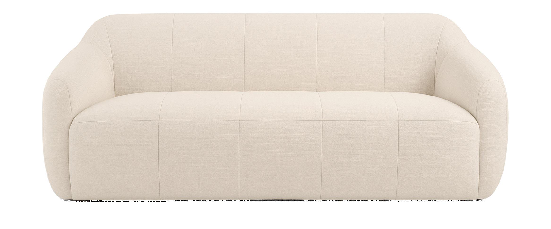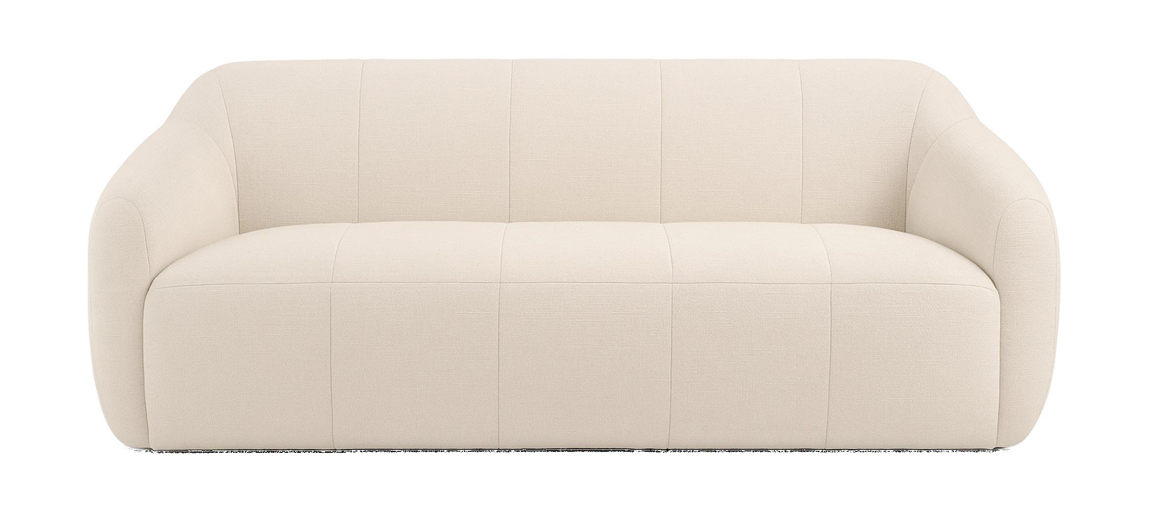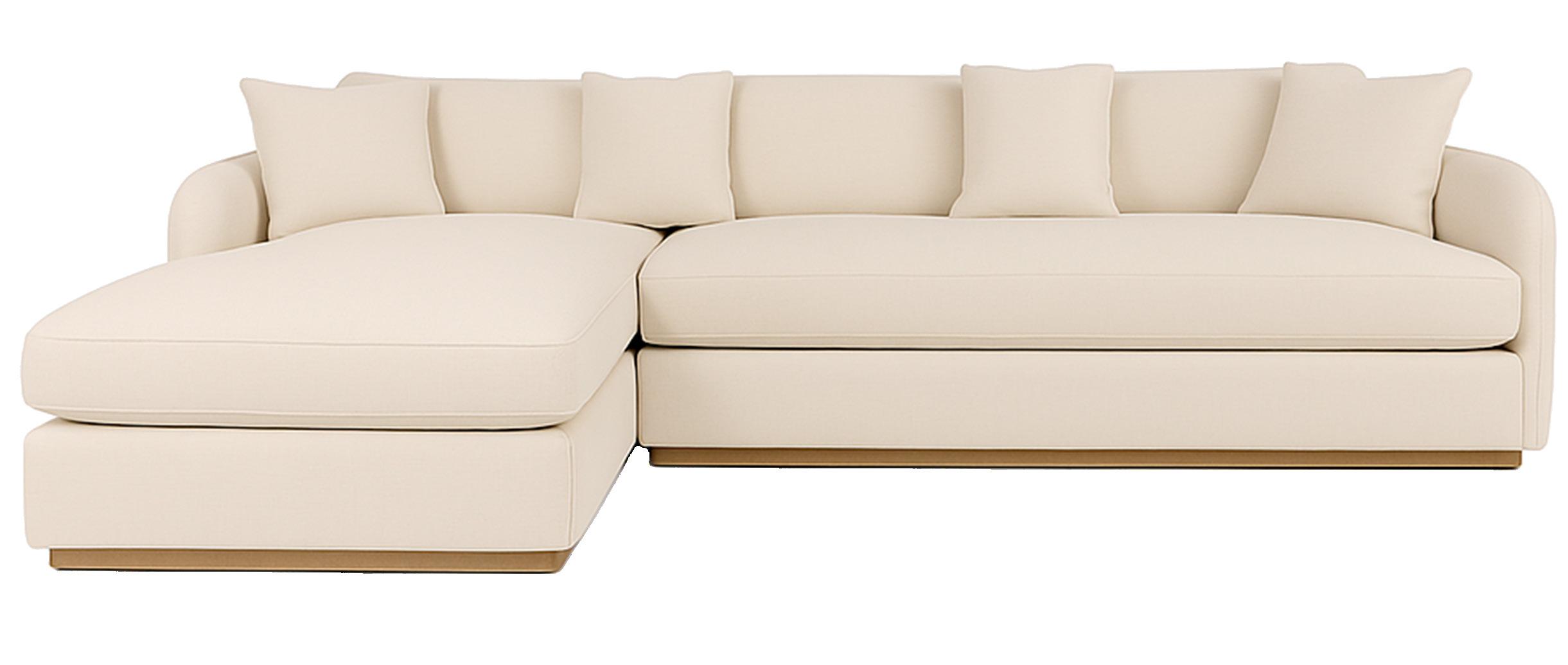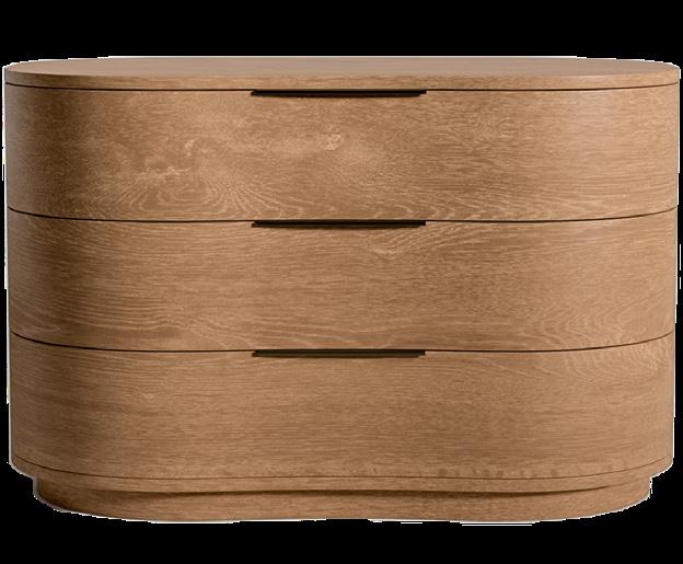 Soft, rounded corners and organic shapes in light wood and woven tones bring a relaxed elegance, while marble accents add a touch of sophistication. The upholstery is customizable in four fabrics, which can be mixed and matched throughout all the pieces in the room.