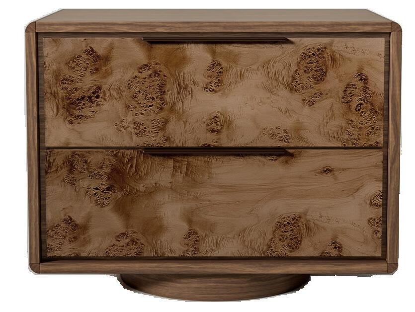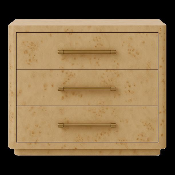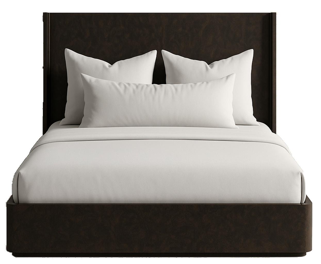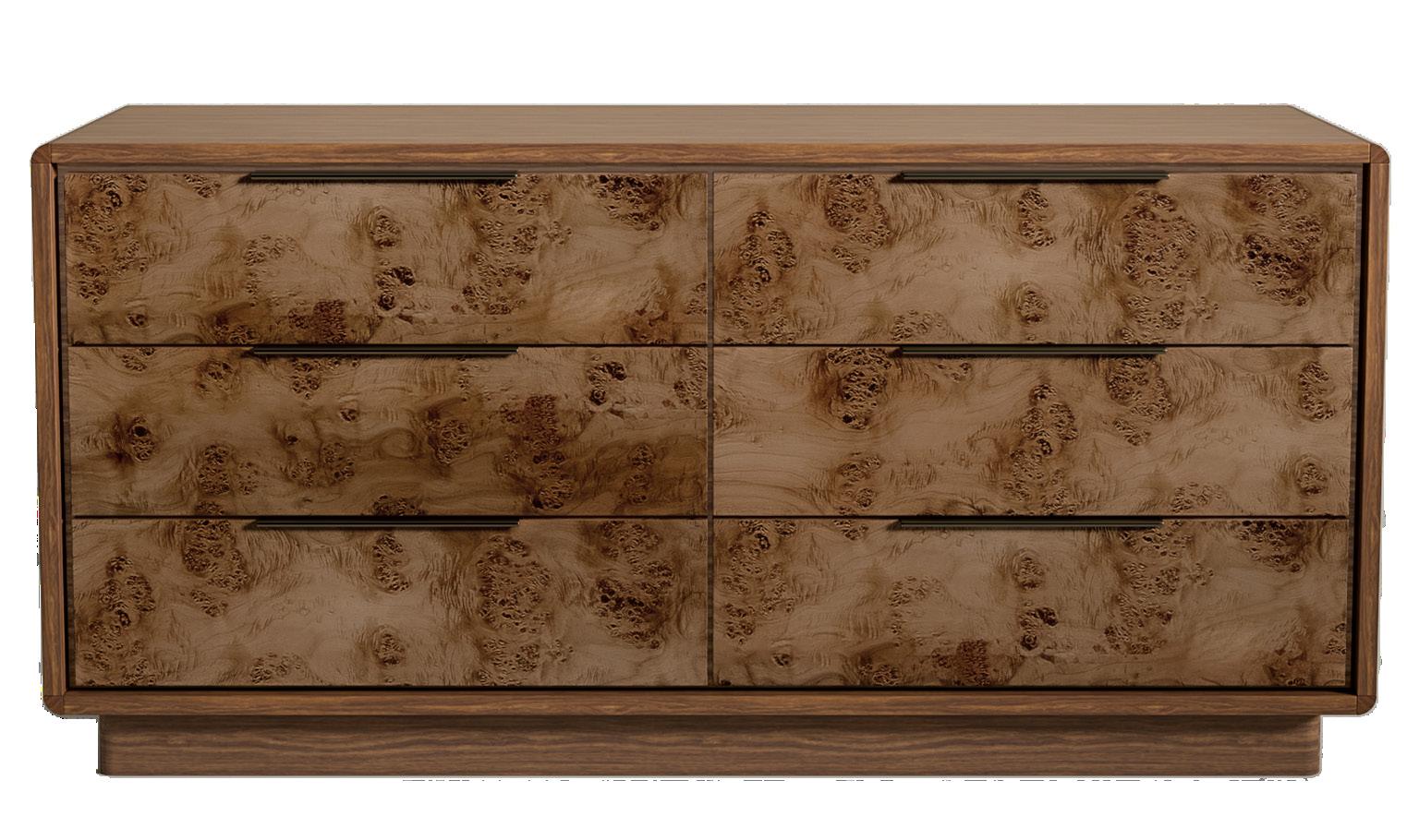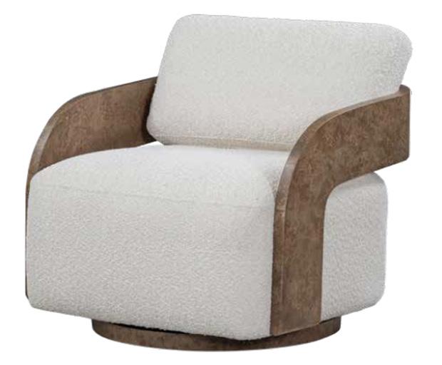Rich in layered wood tones and textured burl accents, this living and sitting room balances warmth and refinement with a sleek console and elegant lamps casting a soft, inviting glow—blending function with elevated design. The upholstery is customizable in four fabrics, which can be mixed and matched throughout all the pieces in the room.