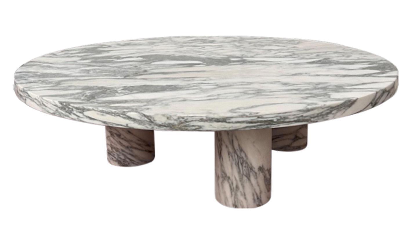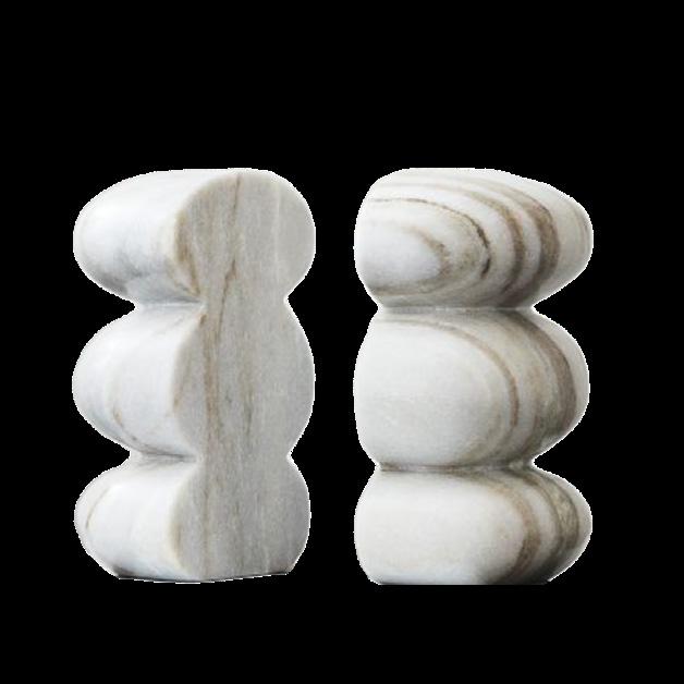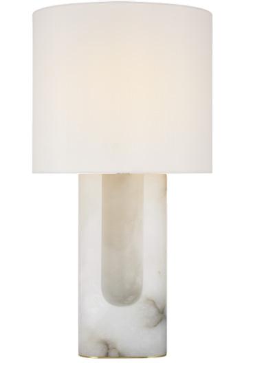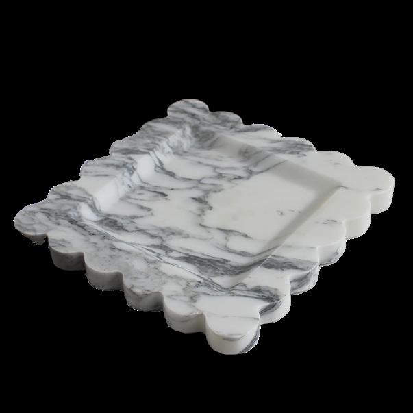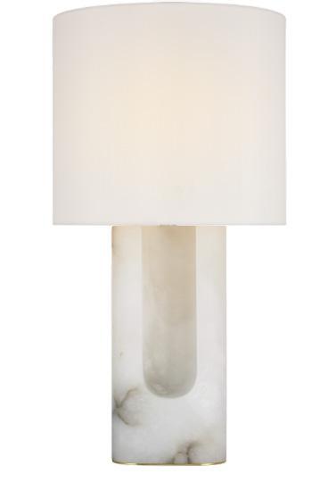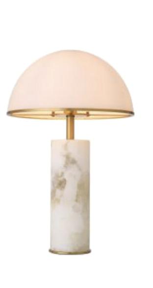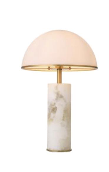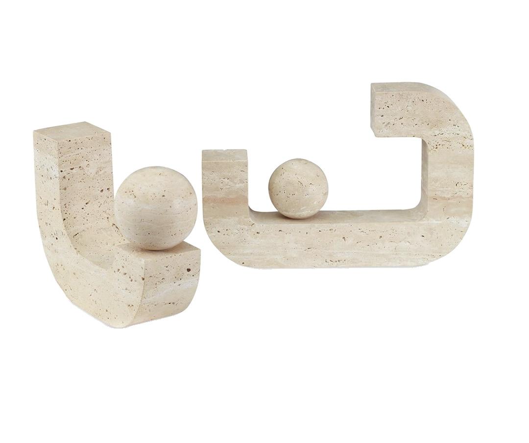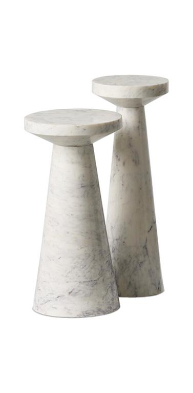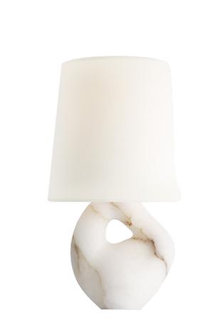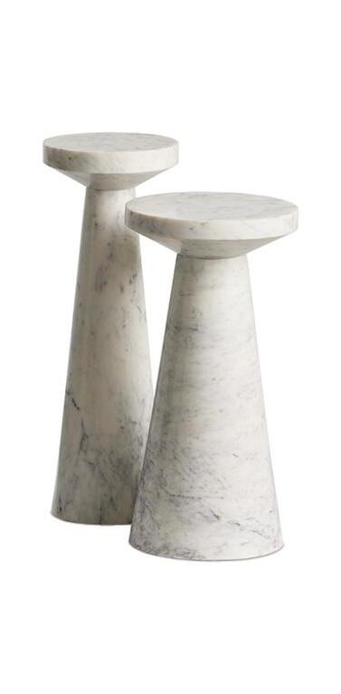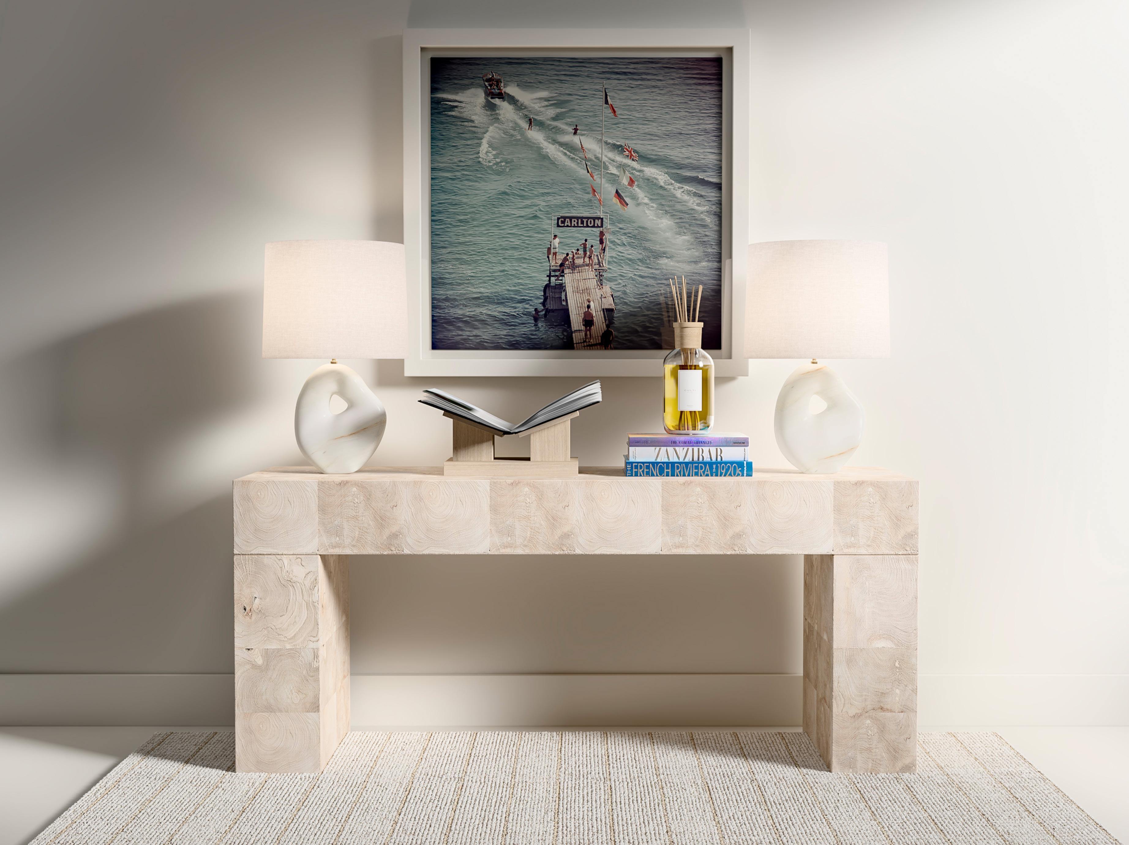 A custom Arabescato marble console makes a sculptural statement with its bold veining and weighty elegance, paired effortlessly with a sleek cordless lamp in brass and travertine for a refined, modern touch.