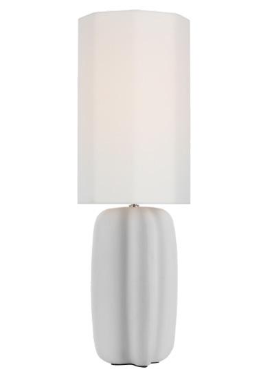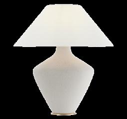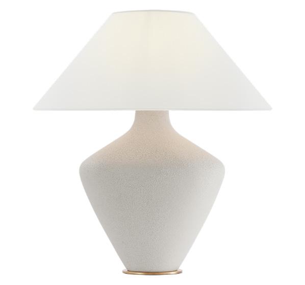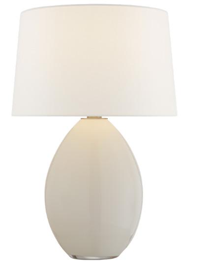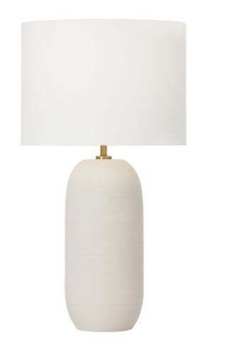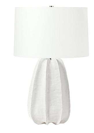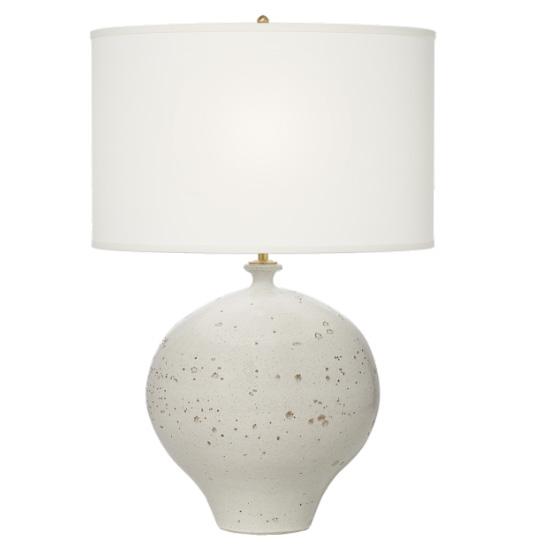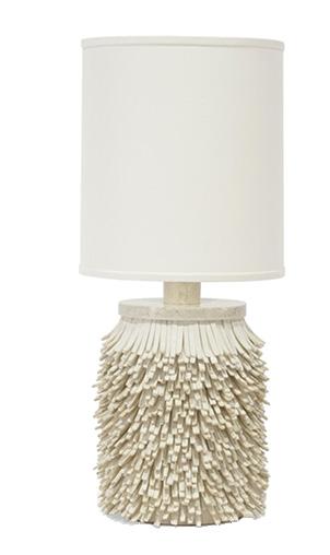 A custom travertine console pairs seamlessly with a luxe lamp from Palecek, featuring a handcut coconut shell base in a soft cream finish and a white linen drum shade.
