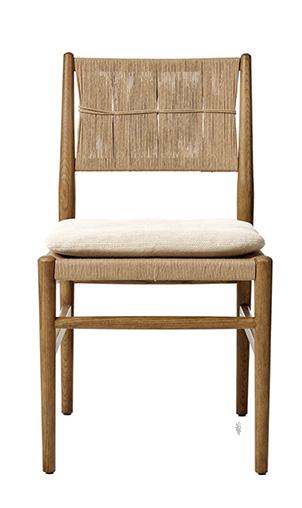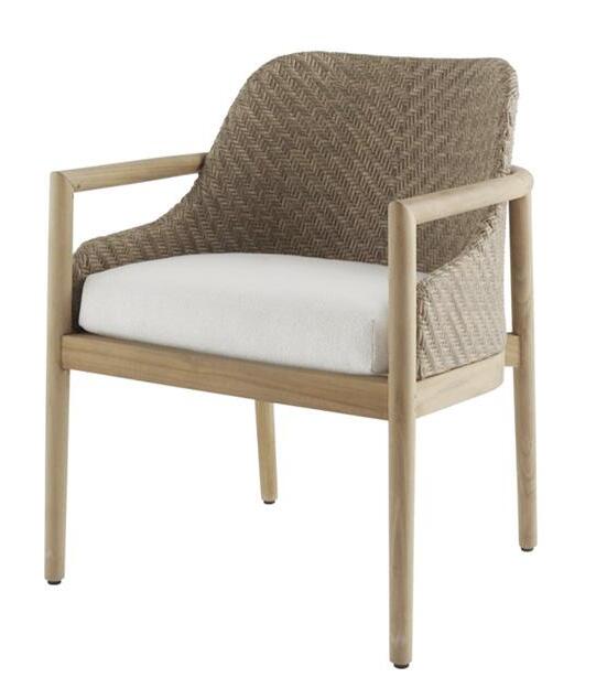 Dining Table with Woven Base in Honey Finish Chilton Outdoor Dining Chair in Natural Teak and Rattan with a Pearl Boucle Pad