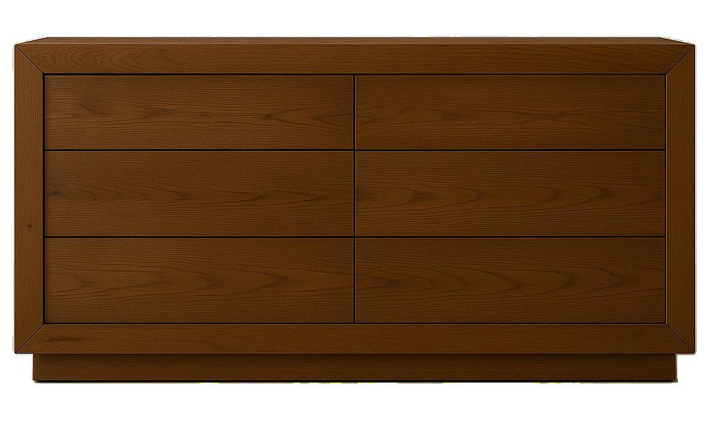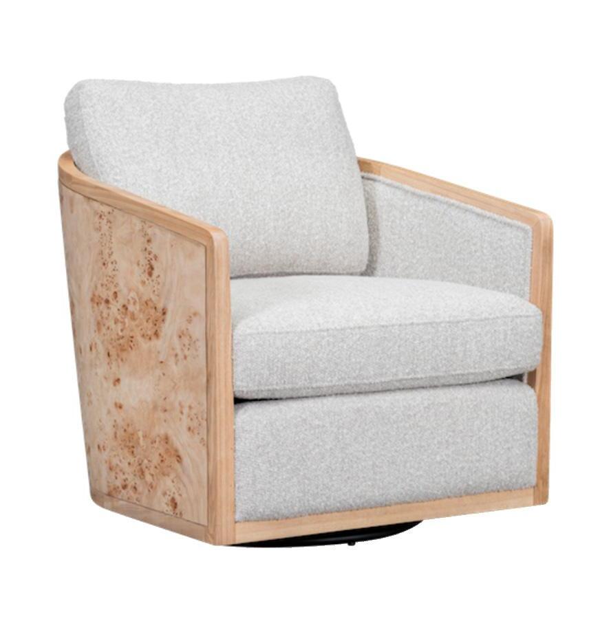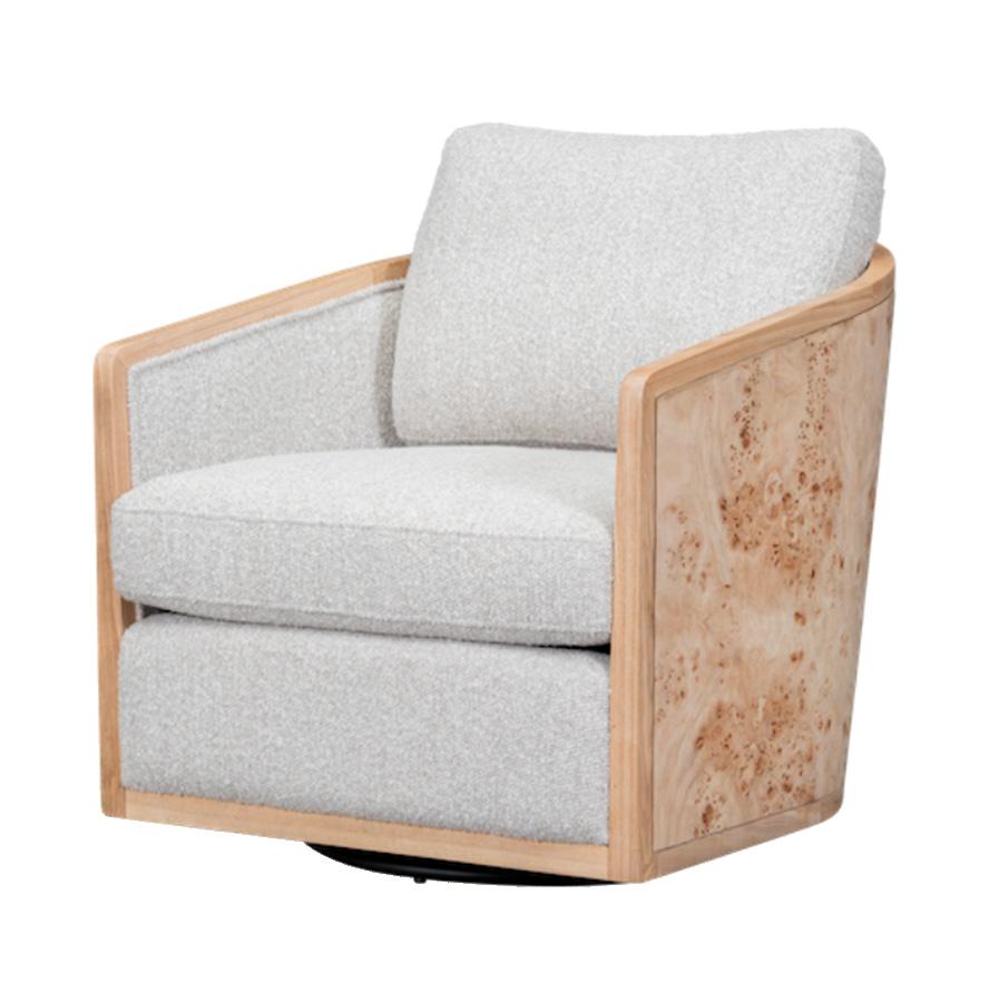 Rich in layered wood tones of light oak and textured burl, this living and sitting room balances warmth and refinement with a sleek console and elegant lamps casting a soft, inviting glow—blending function with elevated design. The upholstery is customizable in four fabrics, which can be mixed and matched throughout all the pieces in the room.