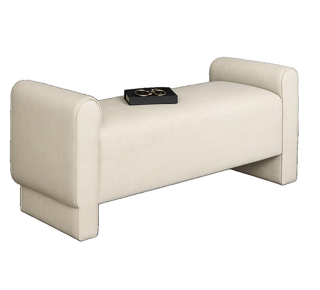 This entry bench combines style and comfort with its unique silhouette. Available in five custom upholstery options | Kealy Lobster | Flemming Mermaid | Subtle Stripe | Coffee & Cream Tweed | Avalia Fog