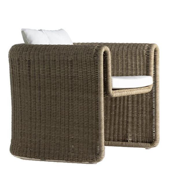 This outdoor living area invites relaxation with its soft tan woven couch, perfect for sinking into on sunny afternoons. A medium-tone wood coffee table and a sculptural occasional chair complete the space, creating a cozy setup for conversation and effortless outdoor lounging.