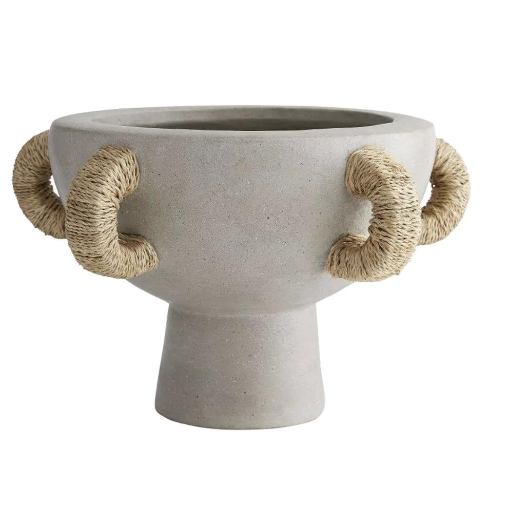 A neutral outdoor sofa sets a relaxed foundation, allowing the vibrant, boldly woven chair to steal the spotlight with its playful pop of color. A charming traditional side table adds character and function, perfect for holding a cool drink or summer read. Anchoring the entire seating area is a creamy concrete coffee table, grounding the space with effortless style and durability.
