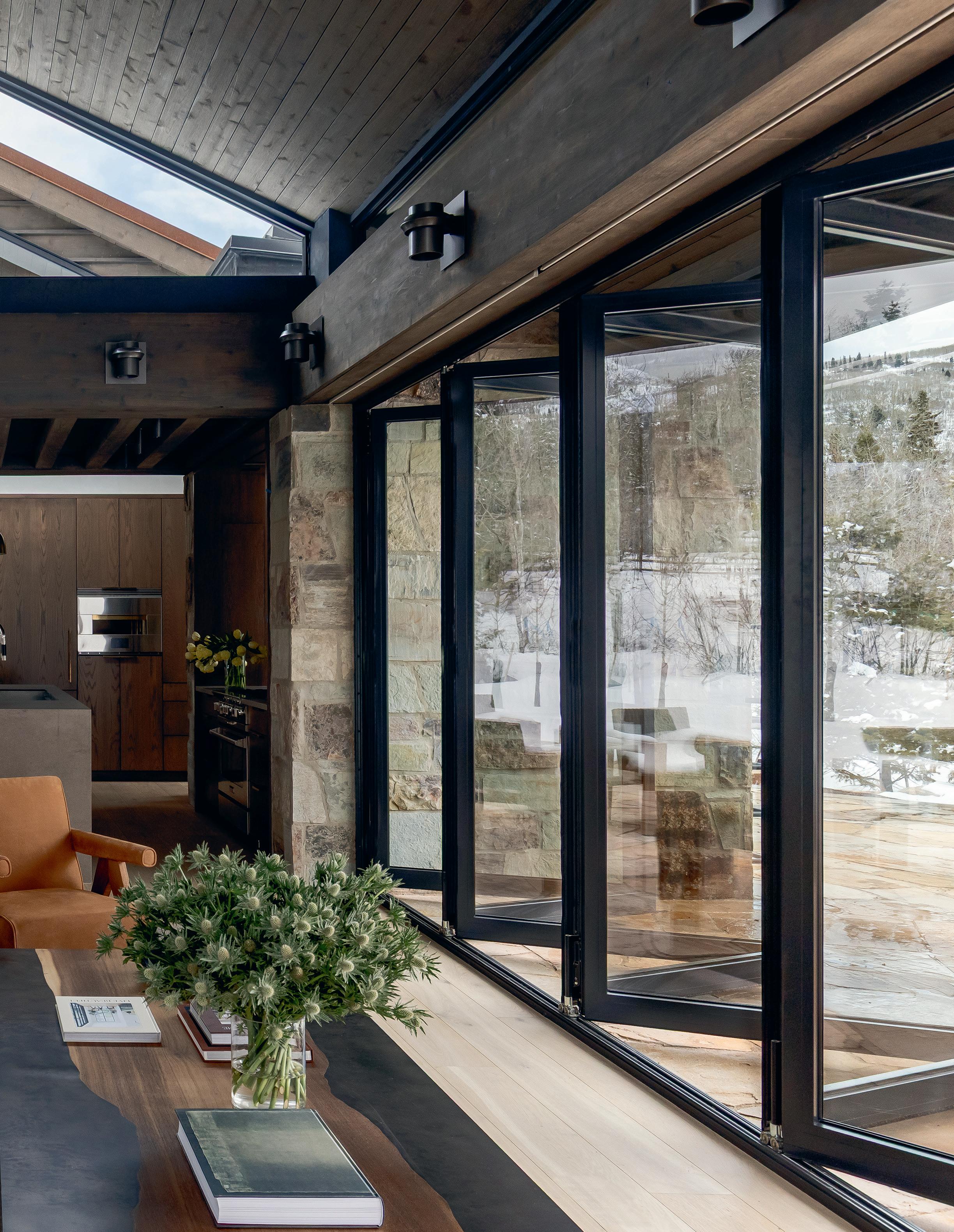 From this vantage point, the striking architecture takes center stage, showcasing exposed beams and finely crafted millwork. Floor-to-ceiling glass accordion doors blur the line between indoors and out, opening seamlessly to the main home. Beyond, the snowy landscape provides a breathtaking backdrop, elevating the sense of openness and connection to nature.