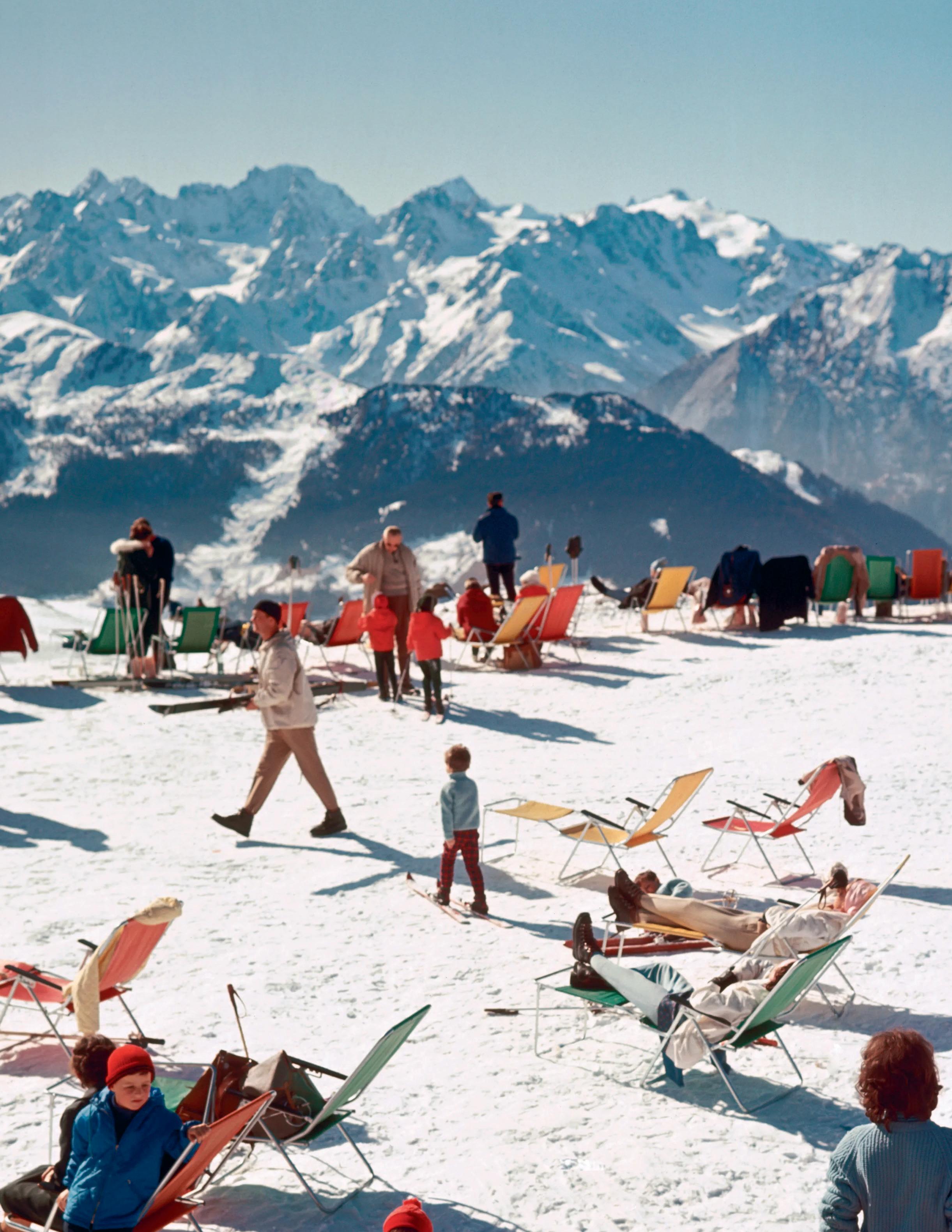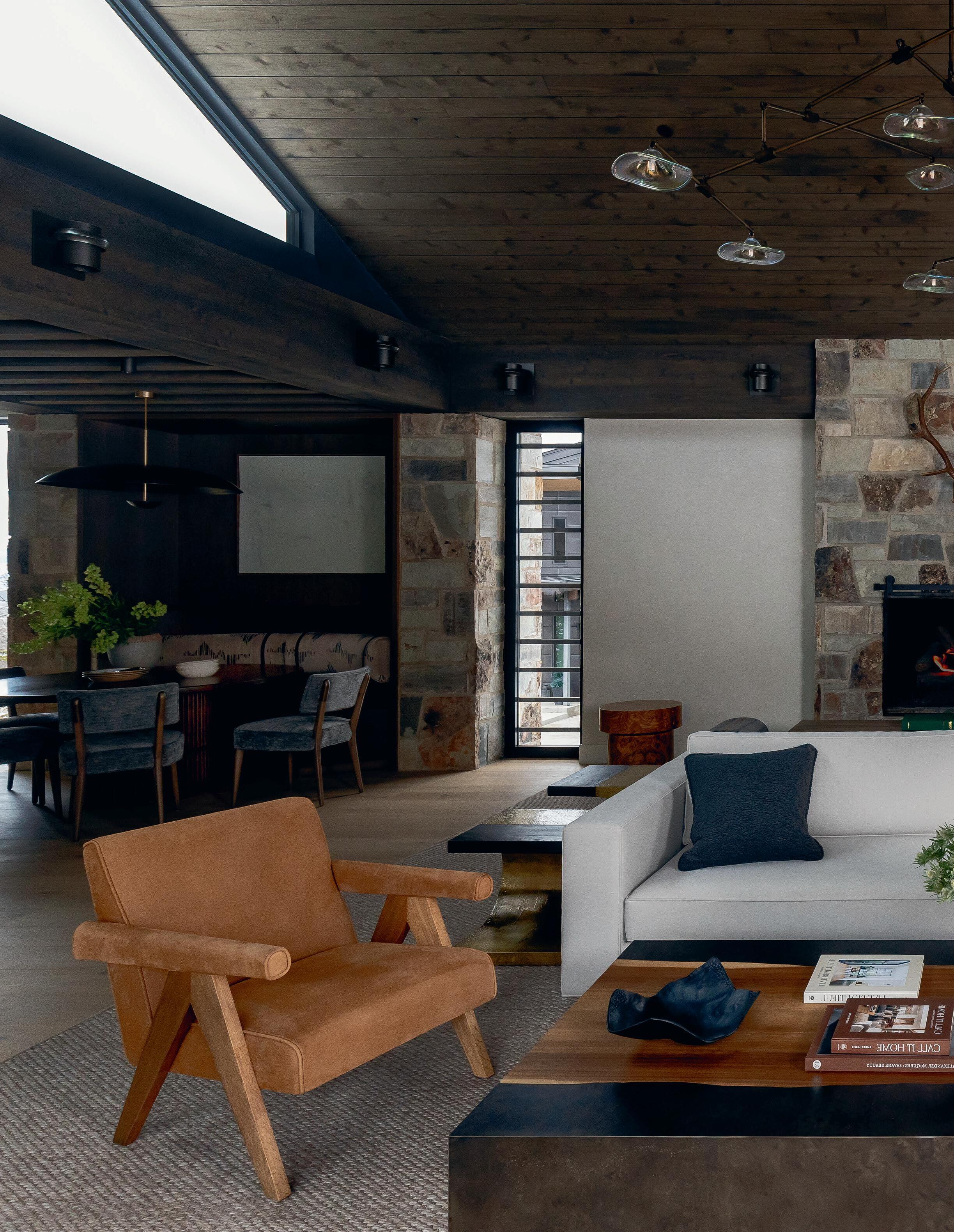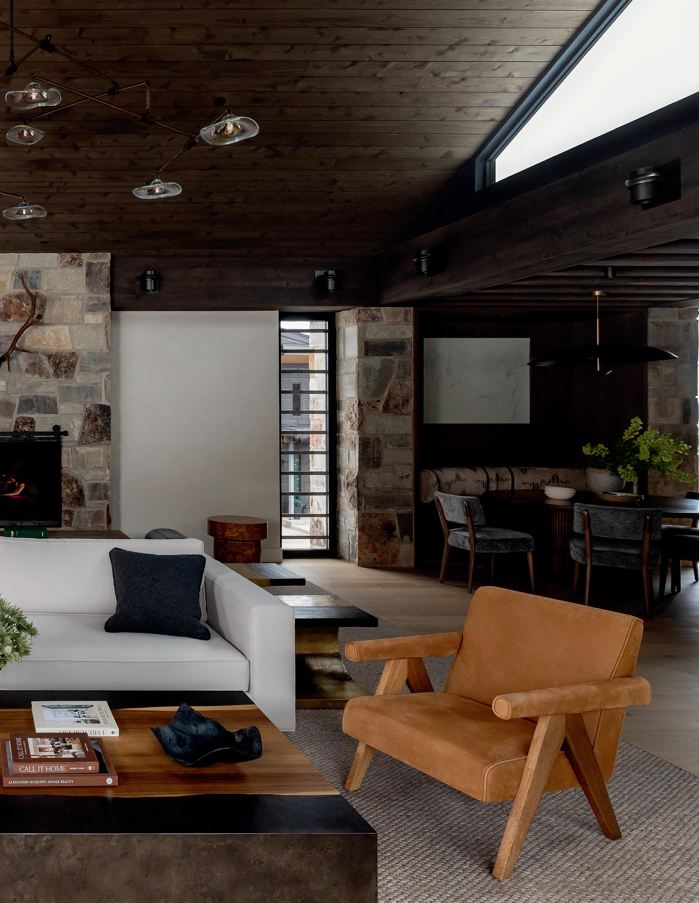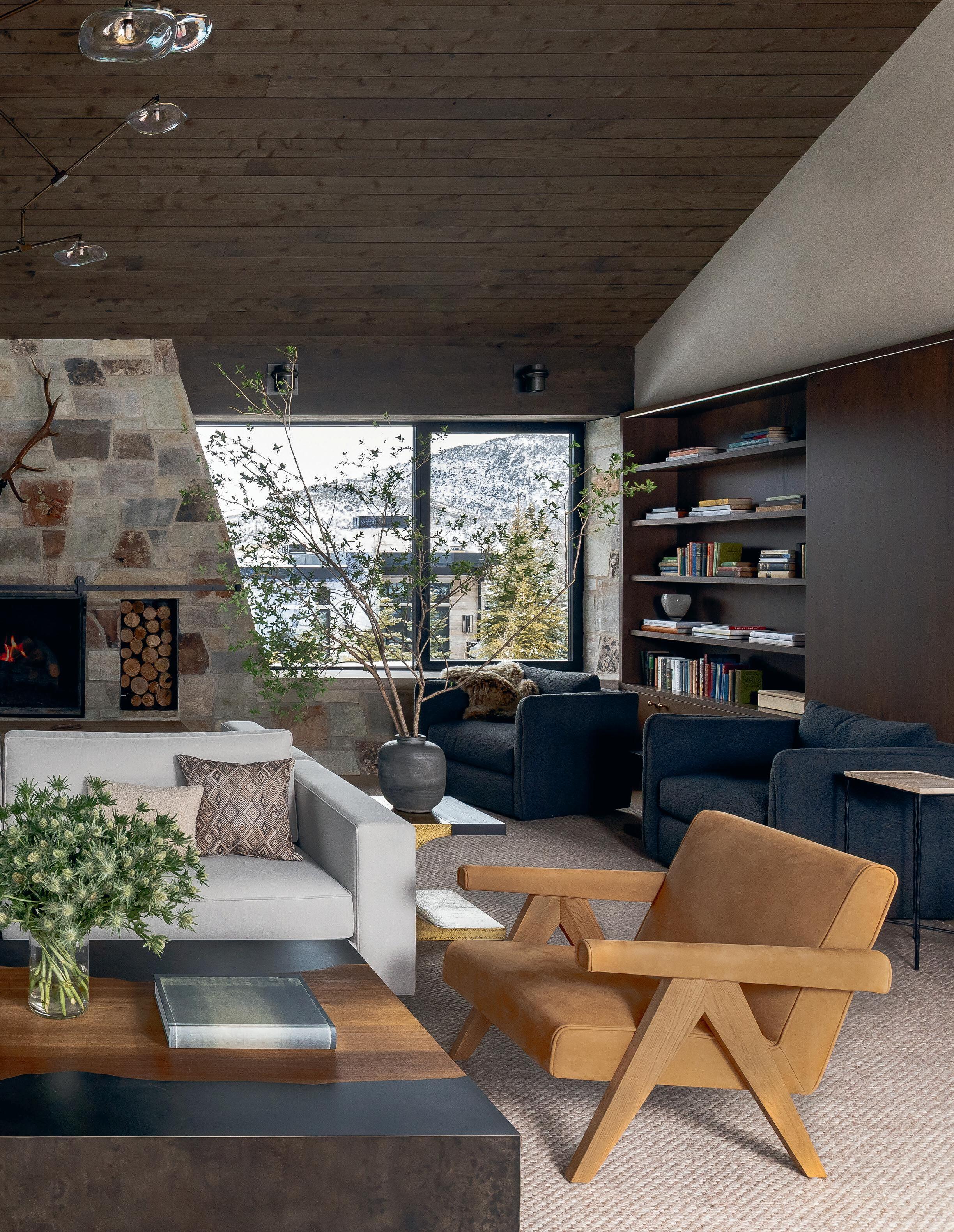 This intimate alpine retreat pairs moody minimalism with rich architectural detail, where vaulted ceilings and finely crafted millwork set a dramatic tone. A sculptural yet airy chandelier from Lindsay Adelman anchors the main living space, complemented by a built-in bookcase and a fireplace flanked in locally sourced stone. The depth of the room allows for an unconventionally layered seating arrangement, where back-to-back sofas and chair groupings form cozy conversational nooks that feel both welcoming and unexpected for the architecture and layout.