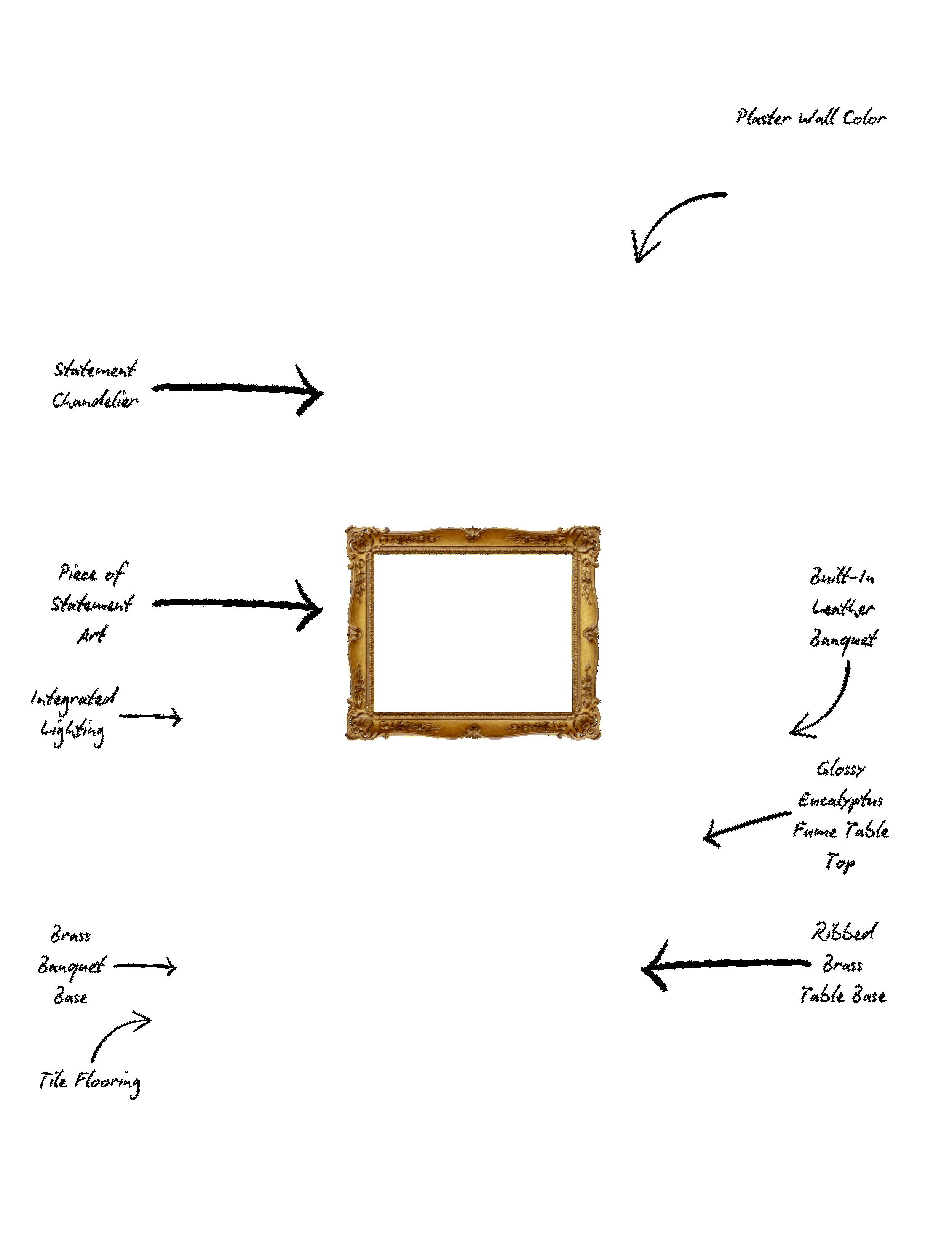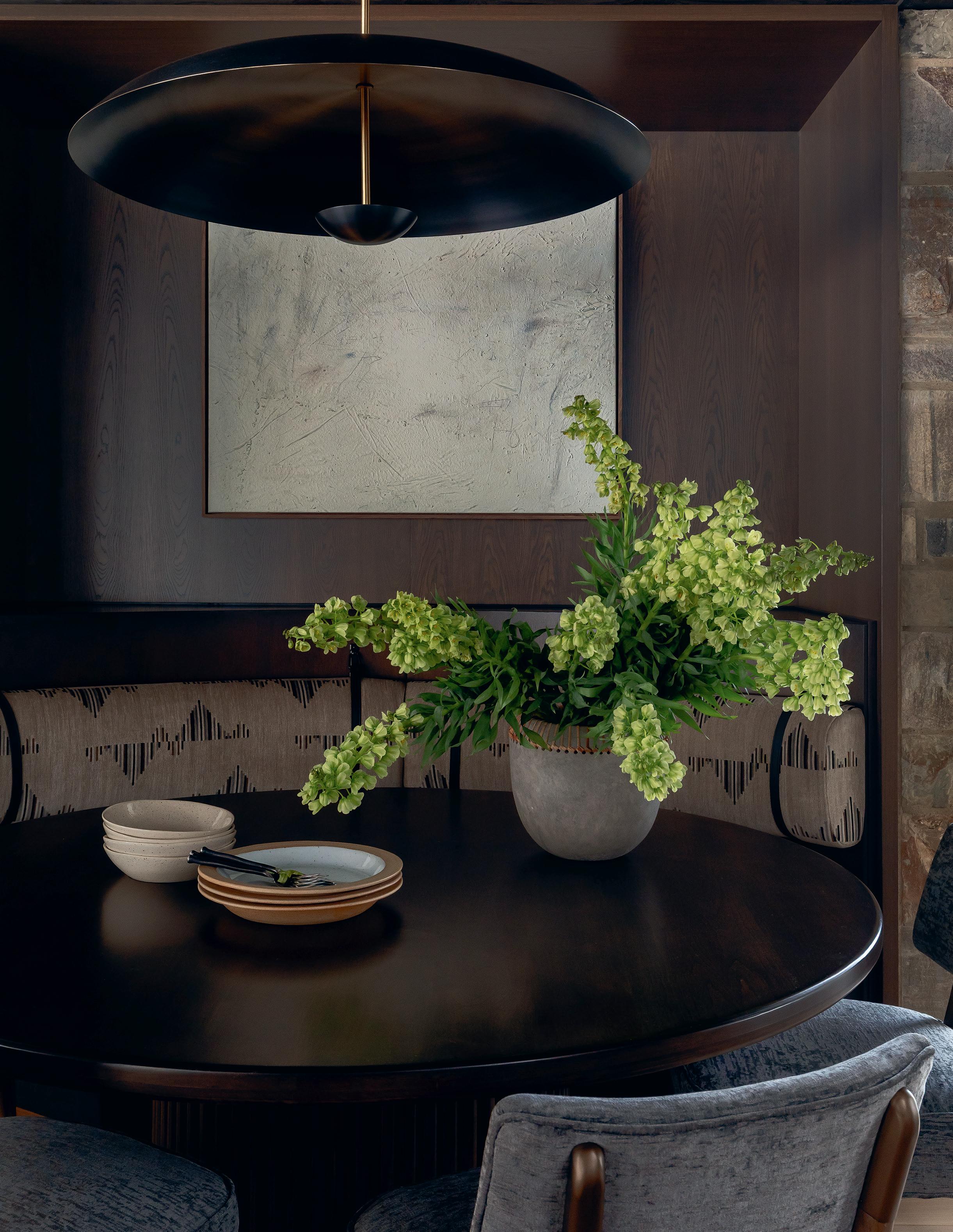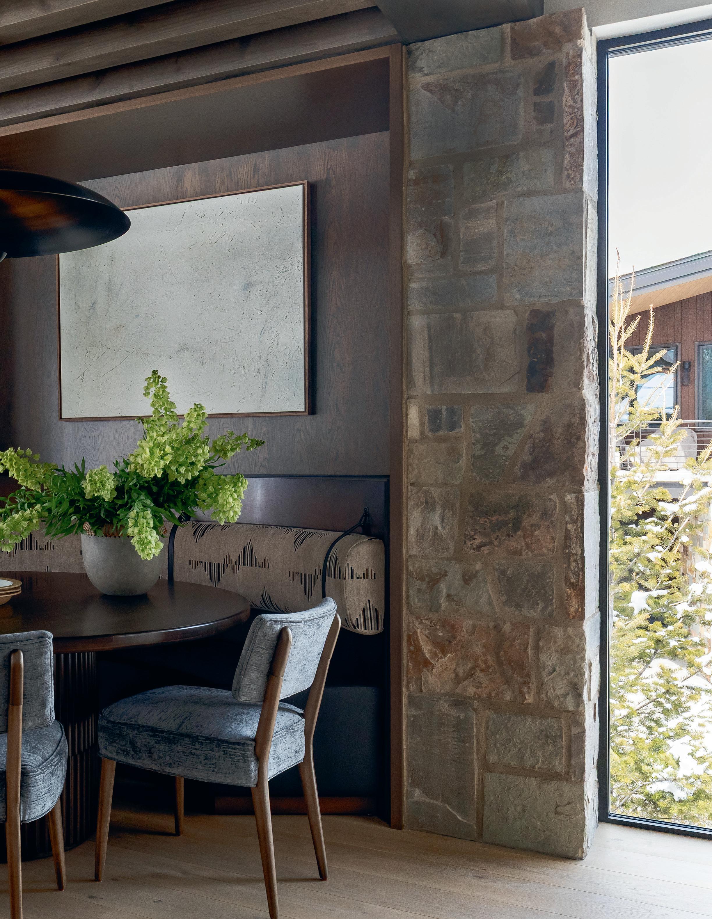 A custom built-in banquette doubles as a dining area, offering extra kitchen seating in a space that feels both functional and intimate. A large patinated bronze and brass pendant casts a soft, ambient glow, highlighting the upholstered bench with its subtle pattern, paired with bluish-grey chairs and a ribbed table base for added texture. Framed by exterior stone and accented with creamy artwork, the nook brings balance and brightness to the moody, layered design.
