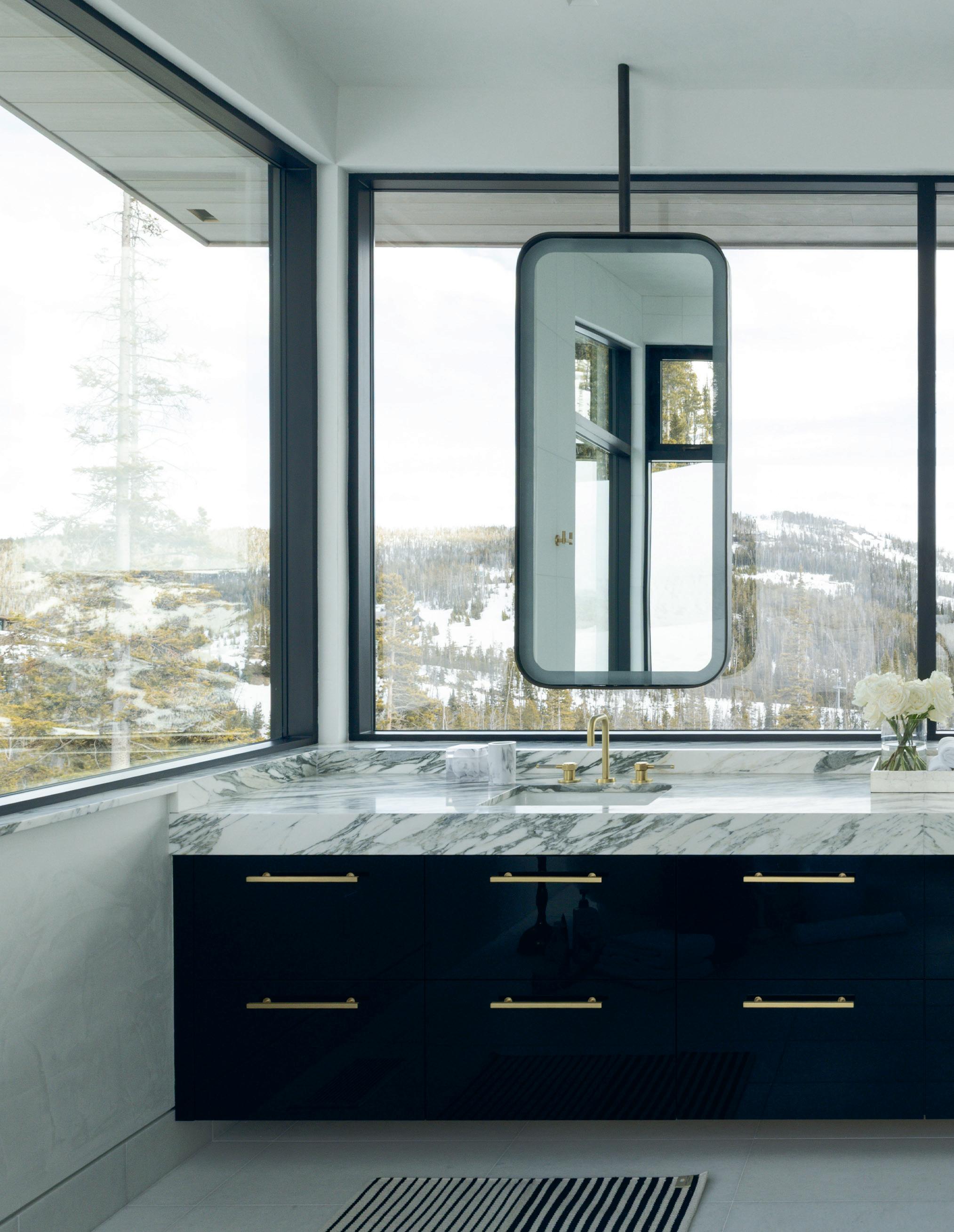 This expansive dining and kitchen space blends a clean aesthetic with bold character and a nod to the mid-century, centered around an organic oak dining table paired with 1950s-inspired cognac leather chairs. The chef’s kitchen boasts two expansive islands clad in soft Mont Blanc natural quartzite slab, while playful colored tile brings a pop of the unexpected. Overhead, industrial metal beams and custom light wood millwork create a striking contrast against the mid-toned wood floors, grounding the space with warmth and texture. The clients chose to forego upper cabinetry in favor of large picture windows, allowing natural light to pour in and framing sweeping views of the surrounding mountains, making the landscape an integral part of the design.