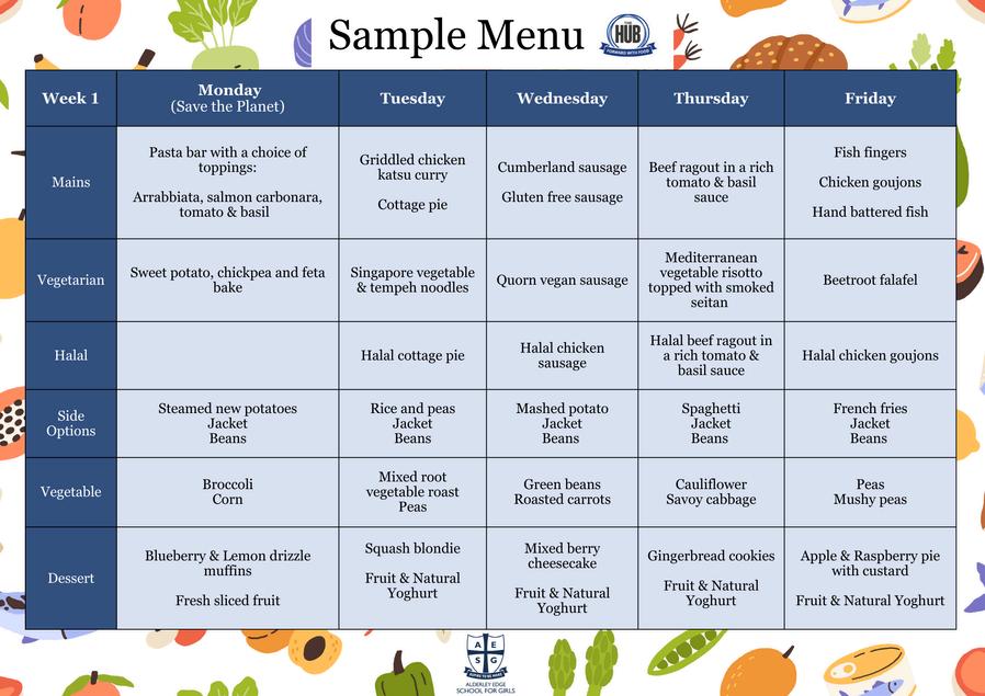 Pre-School and Nursery enjoy a mid-morning snack of toast with a choice of water or milk to drink. A light snack of fruit and a drink of water is provided during the afternoon session. Lunch is served at midday All meals are freshly prepared each day using locally sourced produce. The chefs make their own bread, soups and salads and the girls are encouraged to try a variety of foods from around the world. There is a sample menu below. For girls in the Extended Day sessions, and Afternoon Snack will be served.