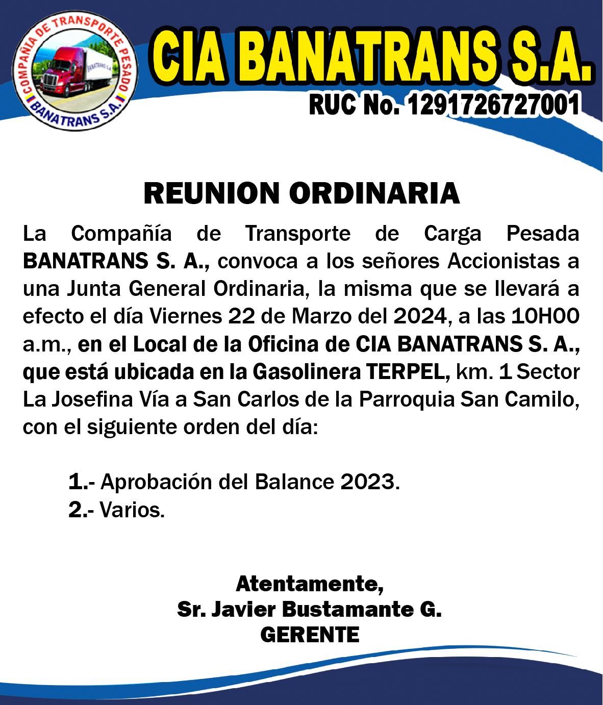 Titular de la Unidad Multicompetente con sede en el Cantón Mocache -Los Ríos. Lo que comunico a usted, para los fines legales pertinentes, previniéndole de la obligación que tiene de señalar casilla judicial y/o correo electrónico, para futuras notificaciones, dentro de los veinte días posteriores a la tercera y última publicación de este extracto, caso contrario se lo considerará y se continuará el trámite en rebeldía. Mocache, Diciembre 12 del 2023.
