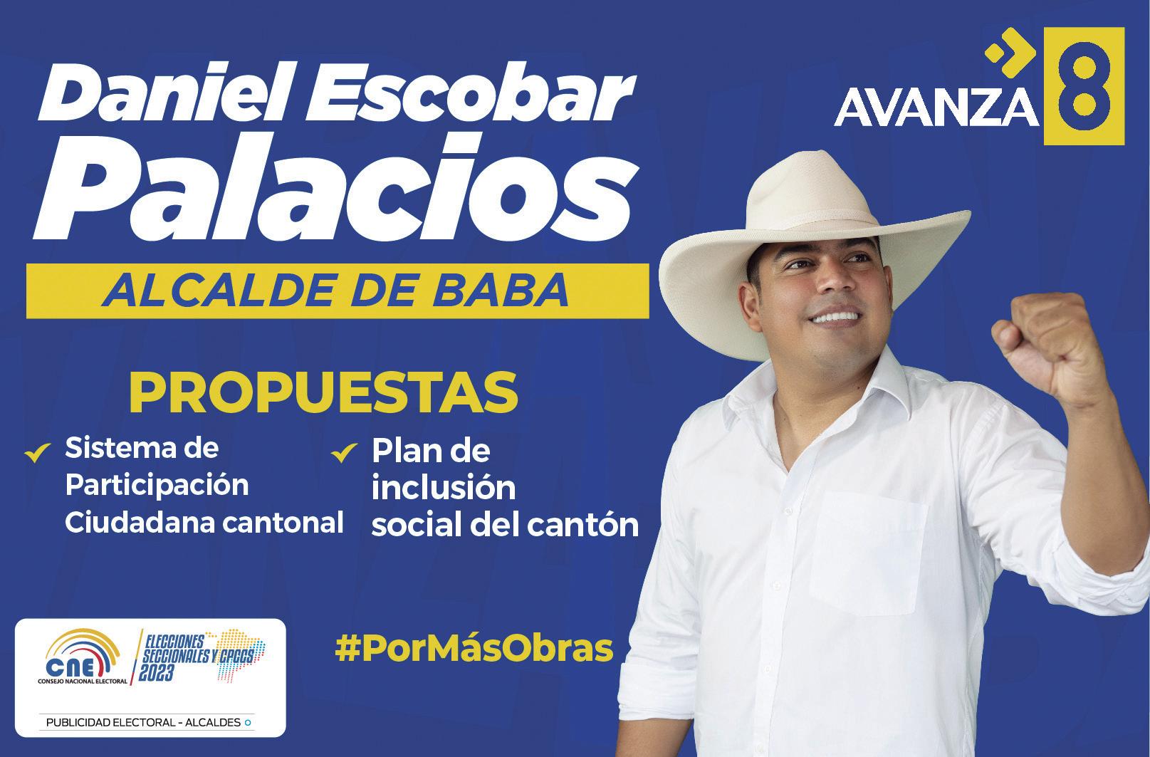 El movimiento Avanza lista 8 en Baba, busca ganar la Alcaldía con su mejor carta, Daniel Escobar Palacios, quien de ser concejal alterno, ahora busca el sillón de la Noble y Torera Baba. Hoy se desarrollará el cierre de campaña, misma que han denominado el tsunami azul, por el color de las miles de banderas que flamean sus simpatizantes y en los recorridos y en cada mitin político que durante este mes de campañas oficiales, se han ejecutado en todo Baba. En efecto, se desarrollará el cierre definitivo en la avenida Guayaquil en el pleno