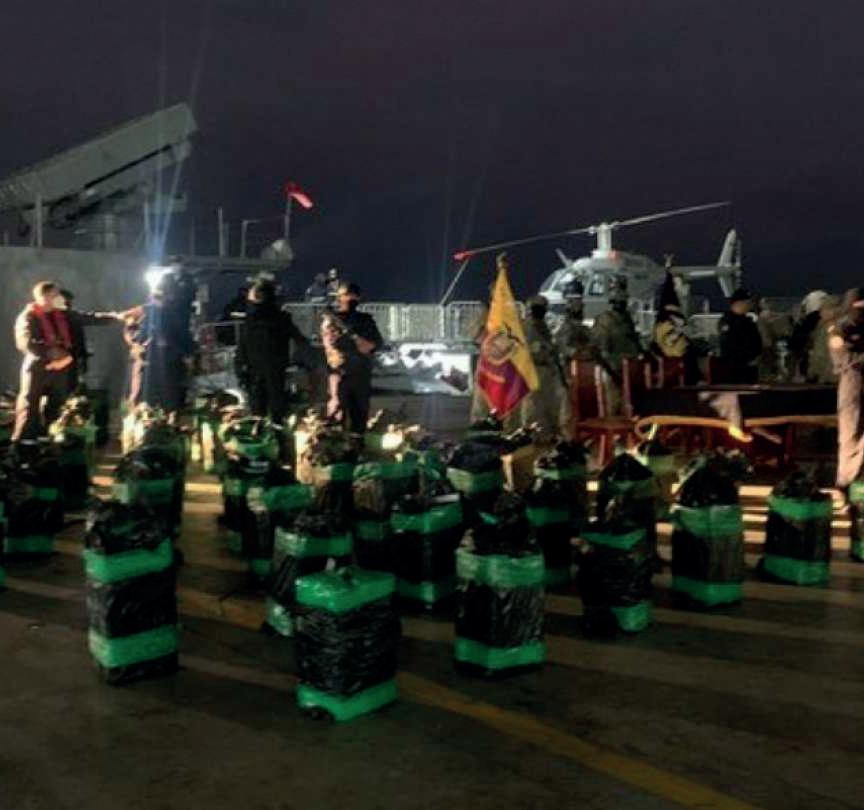 La Armada también dijo que se localizaron "73 bultos de presuntas sustancias sujetas a fiscalización, aproximadamente a 40 millas de las costas ecuatorianas, frente a Esmeraldas y Manabí".
