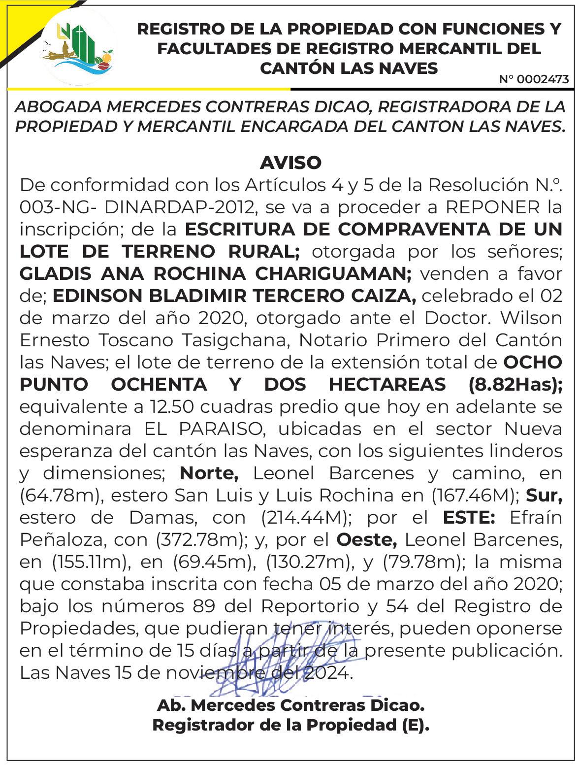 FINA CARPIO TRUJILLO, quienes fallecieron: el 19 de diciembre del año 2013, y 25 de diciembre del año 2022, respectivamente y en su orden. Estos decesos ocurrieron en sus últimos domicilios que tuvieron en su domicilio en el sector Flor de Los Ríos, de la Parroquia Zapotal, del cantón Ventanas - Provincia de Los Ríos, conforme lo acreditamos con los certificados de defunción que acompañamos. BIENES QUE DEBEN INVENTARIARSE.- Los bienes que se deben inventariarse son: 1.- Referente a un lote de terreno (antes de la cabida) de 50 cuadras, desmembrado de la hacienda “CALABI” Sección La Ercilia, ubicado en el Recinto La Ercilia, jurisdicción de la parroquia Zapotal.- 2.- Que refiere a un lote de terreno de la cabida de 20 Cuadras, desmembradas con unas pocas matas de Café y Rastrojal, ubicado en Calabí, Sección La Ercilia, de la parroquia Zapotal - Cantón Ventanas, Provincia de Los Ríos.. 3.- Que refiere a un lote a un lote de terreno de la cabida de 6,00 cuadras, ubicado en el Punto La Ercilia de la Parroquia Zapotal Cantón Ventanas, Provincia de Los Ríos. 4.Que refiere a un lote a un lote de terreno de la cabida de 6,00 cuadras, ubicado en el sitio Calabi de la Parroquia Zapotal Cantón Ventanas, Provincia de Los Ríos. 6.- LOS FUNDAMENTOS DE DERECHO. Sustentamos nuestra demanda de facción de inventarios y avalúos de los bienes de las mortuorias de los cónyuges CARLOS AUGUSTO VILLACIS GARCIA, y JOSEFINA CARPIO TRUJILLO, en las normativas del: Código sustantivo Civil. Art. 997, 1344, 996, 997, 1306, Art. 618 del C.P.C., Código Orgánico General de Proceso, Art. 341, Código Orgánico de Organización Territorial, Autonomía y Descentralización “COOTAD.”, dispone: “Art. 473.- Le solicitamos que en sentencia se dé por aprobado nuestra demanda de facción de