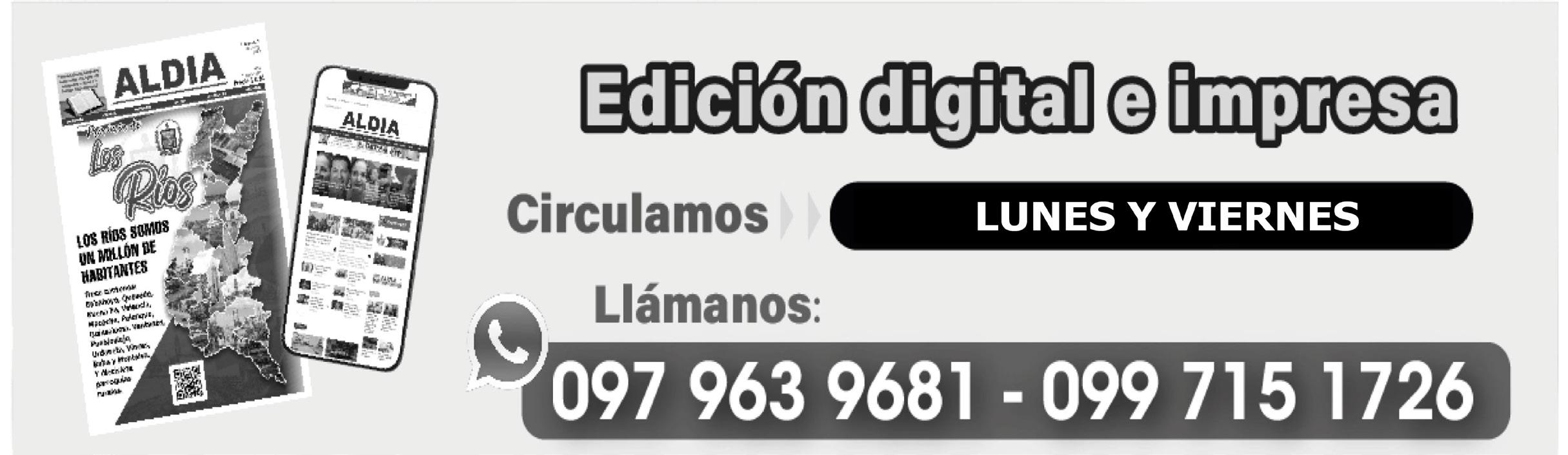 Babahoyo: C.C. Bahía Calderón local #4, Av, 6 de Octubre y Clemente Baquerizo Mail: info@aldia.com.ec infoaldiacomec@gmail.com