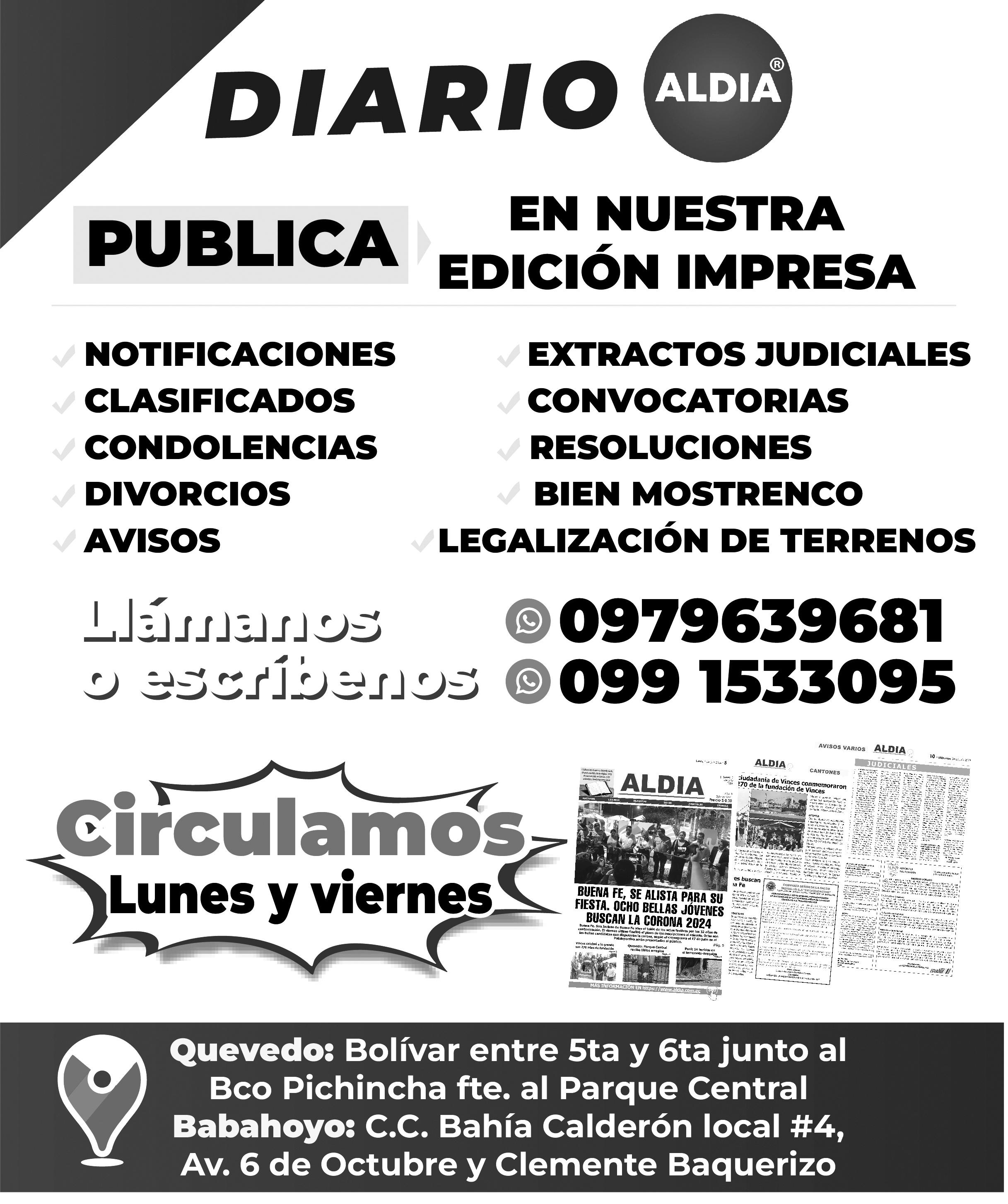 Babahoyo: C.C. Bahía Calderón local #4, Av, 6 de Octubre y Clemente Baquerizo Mail: info@aldia.com.ec infoaldiacomec@gmail.com