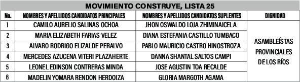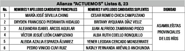 La Junta Provincial Electoral de Los Ríos calificó las candidaturas de elección popular de la dignidad a asambleístas provinciales para las Elecciones Presidenciales y Legislativas Anticipadas 2023. En vista de no haberse presentado recursos administrativos o subjetivos contenciosos electorales a las resoluciones, los candidatos principales y suplentes de las candidaturas son los siguientes: