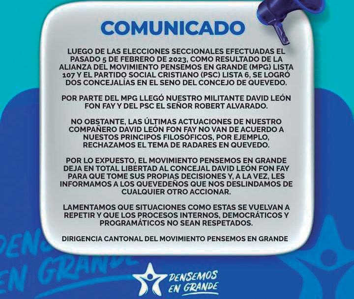 En un comunicado dirigido a los quevedeños que circuló el domingo 27 de agosto por las redes sociales la dirigencia cantonal del Movimiento Pensemos en Grande anunció que se distancia de las actuaciones y decisiones del concejal David León Fon Fay.