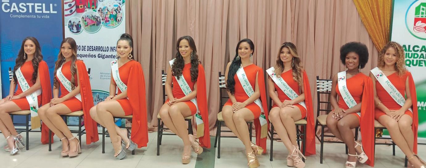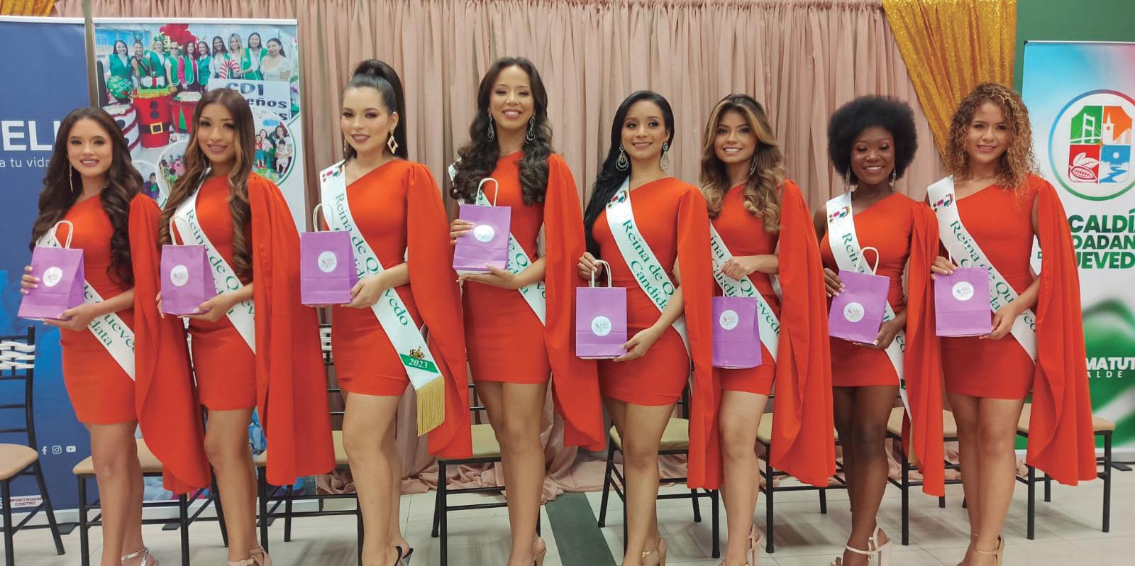 La gala se realizará el próximo 15 de septiembre, en la Expoferia-Quevedo, conoce a las candidatas: Sanyi Thalia Ortega Saltos (21 años), Silvana Belén Cortez Valencia (18 años), Angie Arielys Álava Alvarez (20 años), Perla Taneisha Guzmán Arce (19 años), Luz Thailyn Ortega Bravo (19 años), Carol del Cisne Lalangui Morán (21 años), Ashley Thaís Gallardo García (18 años) y Mahyza Elizabet Quevedo Vélez (19 años)