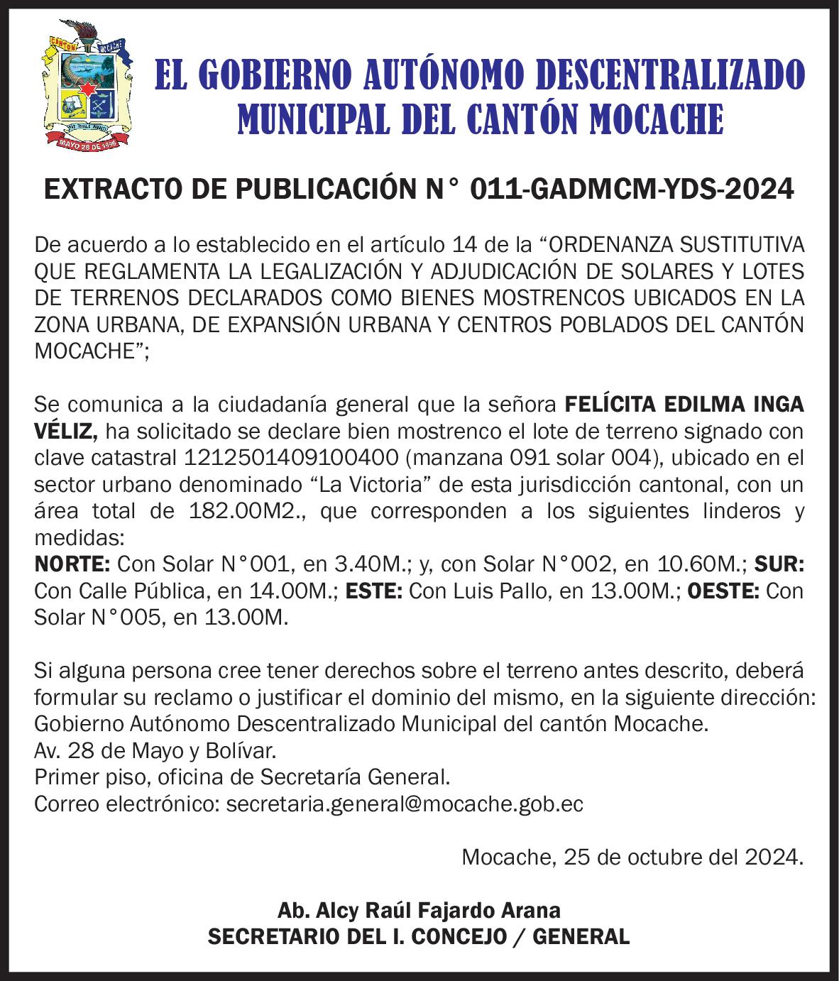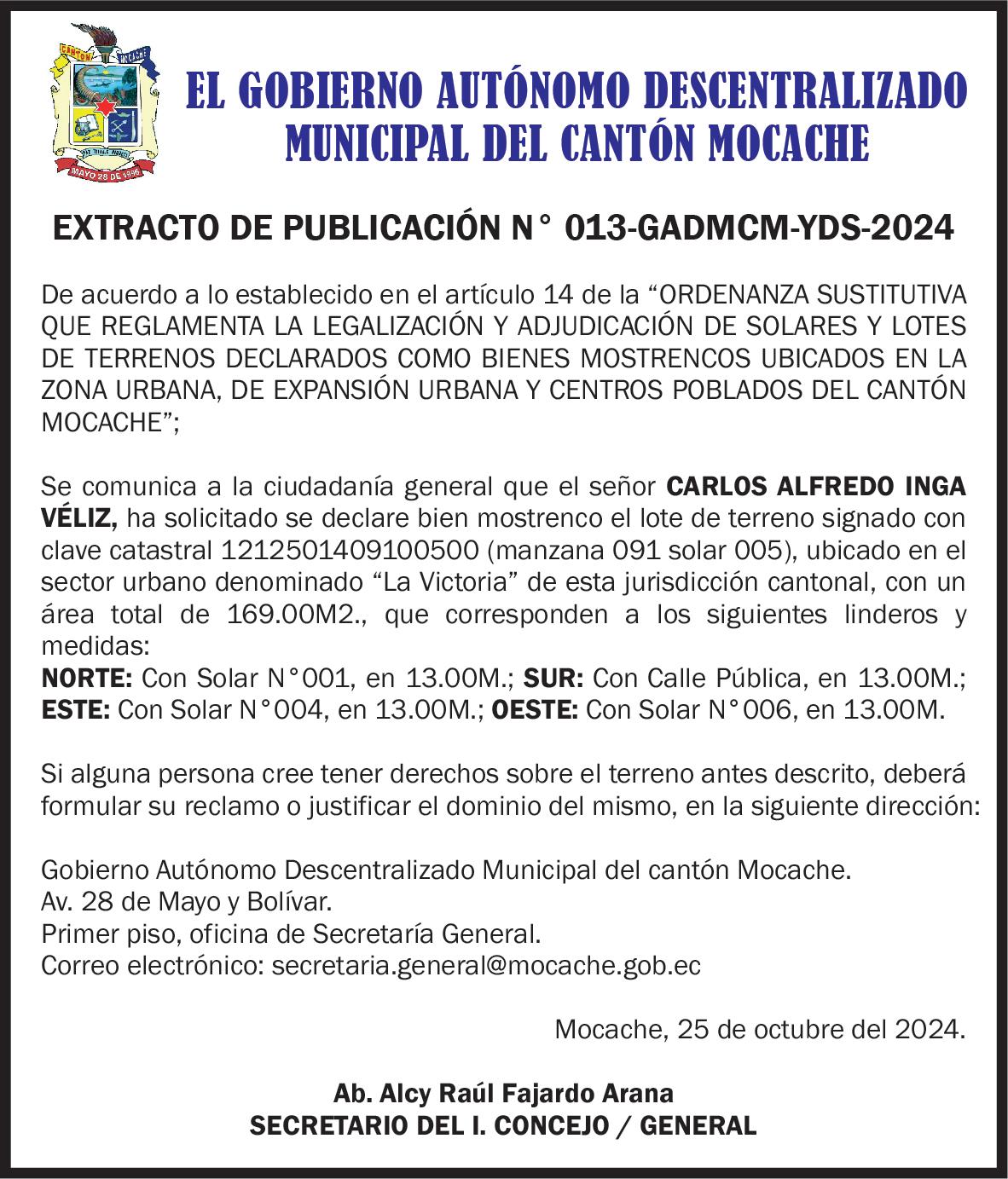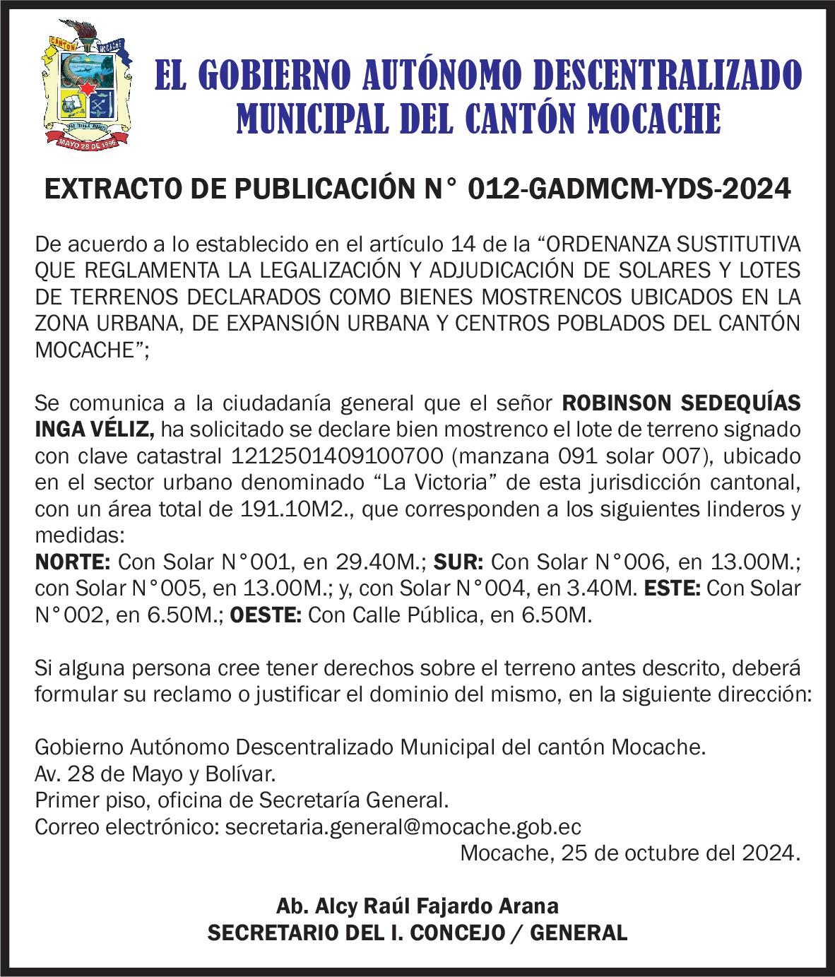 Lo que comunico a usted para los fines legales consiguientes, advirtiéndole la obligación que tiene de señalar casillero judicial para las notificaciones correspondientes, dentro de los veinte días posteriores a la tercera y última publicación de esta Citación. Quevedo, 18 de Octubre del 2024.