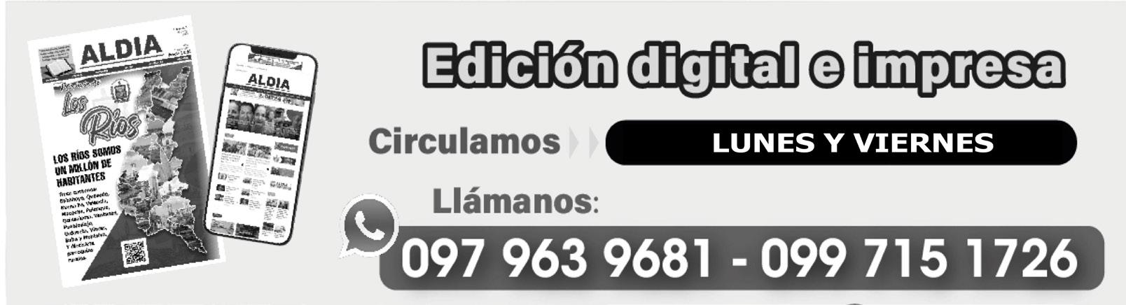 Babahoyo: C.C. Bahía Calderón local #4, Av, 6 de Octubre y Clemente Baquerizo Mail: info@aldia.com.ec infoaldiacomec@gmail.com