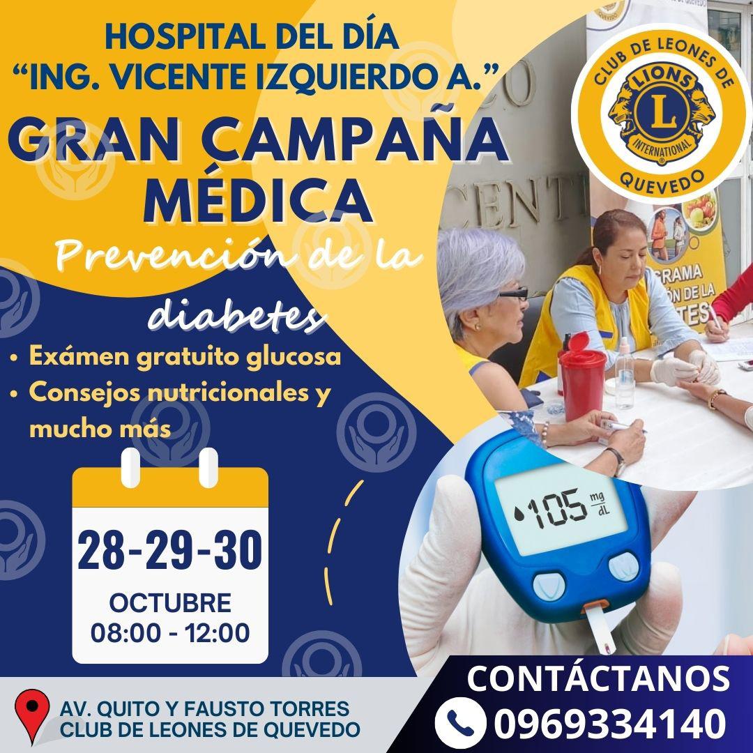 En un esfuerzo por llevar atención médica gratuita a la comunidad, el Hospital del Día “Ing. Vicente Izquierdo Aguilera” del Club de Leones realizaron una gran brigada médica gratuita. La jornada se llevará a cabo el 26 de octubre, de 08:00 a 12:00. Los servicios médicos gratuitos incluyen consultas en Medicina General, Medicina Interna, Pediatría, Ginecología y Odontología. Además, los asistentes podrán realizarse exámenes de glucosa sin costo, recibir un examen de agudeza visual y, en caso de ser necesario, lentes de lectura gratuitas. La comunidad de Nueva Zulema y sus alrededores fueron invitados a beneficiarse de esta jornada médica. La misma jornada médica se realizará este 28,29 y 30 de octubre en la sede del Club de Leones de Quevedo, ubicada en la avenida Quito y Fausto Torres.