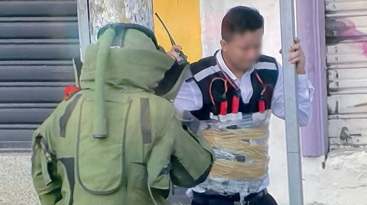 Según información entregada por la Policía Nacional, el ciudadano es trabajador de una joyería.Unidades especiales liberaron el chaleco explosivo del joven. El joven fue dejado afuera de la joyería.
