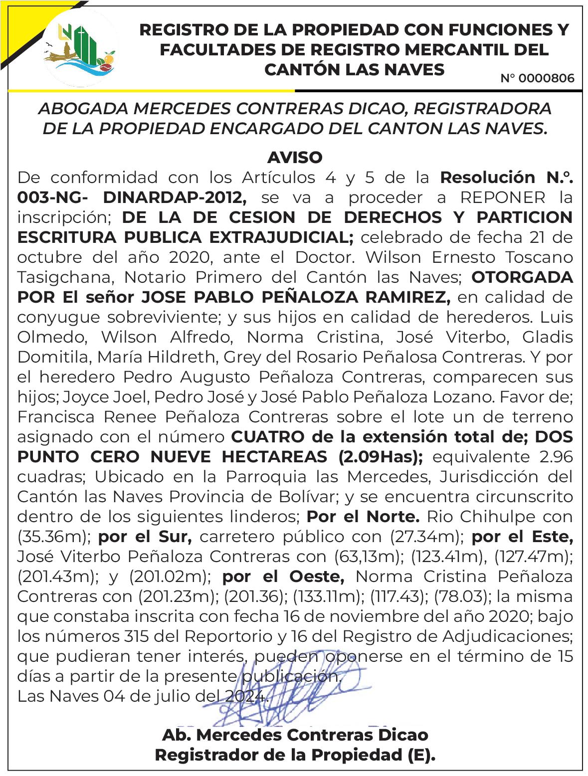 JUEZA DE LA CAUSA.-Mediante providencia la Jueza Ab. MONICA DIAZ FUENTES, Msc, de fecha 20 de junio del 2024 a las 15h21, DISPONE; En aplicación de lo dispone el Art. 68.1 del COGEP únicamente se dispone que mediante una sola publicación en la forma y con los efectos señalados en el artículo 56 ibídem, se NOTIFIQUE POR LA PRENSA en un periódico de amplia circulación de la ciudad de Quevedo, a los herederos desconocidos de quien en vida se llamó CIRILO MARTINEZ MARTINEZ, previniendoles que de manera obligatoria y oportuna deben señalar correo electrónico y/o casilla judicial para recibir sus notificaciones y ejercer su derecho a la defensa. Quevedo, 24 de junio del 2024