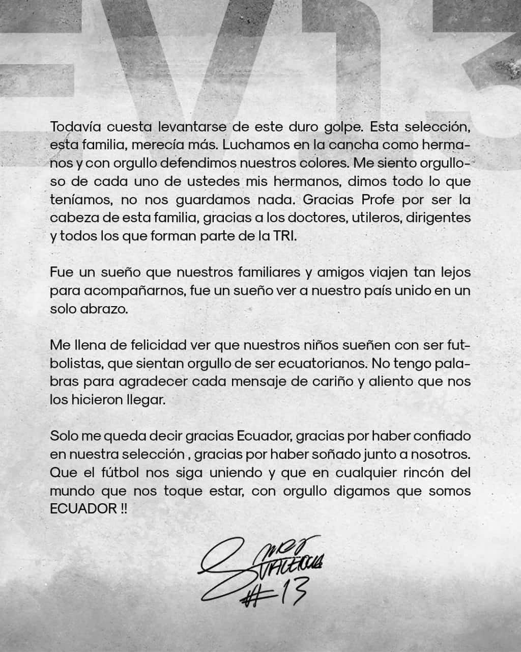 nada. Gracias Profe por ser la cabe za de esta familia, gracias a los doc tores, utileros, dirigentes y todos los que forman parte de la Tri”, detalla el capitán dela selección de Ecuador. Su texto continúa indicando: “Fue un sueño que nuestros familiares y amigos viajen tan lejos para acom pañarnos, fue un sueño ver a nues tro país unido, en un solo abrazo”, concluye el futbolista. El posteo se volvió viral y recibió las demostracio nes de afecto y cariño de todo un país que siguió la participación de Ecuador en el mundial de Qatar.