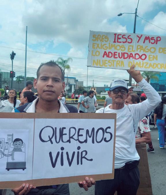 QUEVEDO. Con gritos de "queremos vivir" un grupo de trabajadores de la salud, familiares y pacientes de diálisis llegaron hasta la avenida Quito para protestar por la falta de pago del Gobierno Nacional a las clínicas dializadoras.