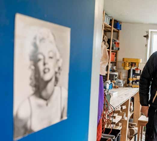 Der er intet prangende over repa rationscaféen i Glyngøre. Den holder til i nogle mindre lokaler i den ene ende af Glyngøre Skole. Dørene er blåmalede, og håndtagene knirker lidt og blander sig med lyden af børn, der leger og skyder til fodbolde, og så stemmer fra mænd, der snakker. De sidder på gam le stole omkring to borde, der er trukket sammen, og på plastikdugen ligger en oprevet bagerpose med rundstykker. Køk kenrulle udgør tallerkener. Kaffen damper fra kopperne, mens snakken går om elpri ser, om manglen på skrubber i Limfjorden og om, hvordan Tour de France-vinder og bysbarn Jonas Vingegaard nogle gange su ser forbi på cykelstien uden for skolen og overhaler bilernes 50 kilometer i timen.