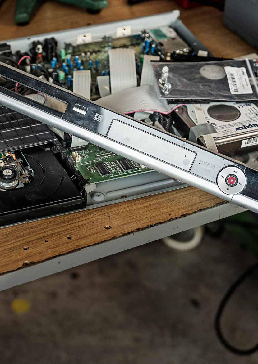 Ved siden af bordet med DVD-af spilleren, som er skilt ad, står et skab med loddekolber og forskelligt værk tøj. Egentlig begyndte reparations caféen på John og Haralds private initiativ. Men der gik ikke længe, før formanden i lokalafdelingen af Ældre Sagen, Aase Brøndum, kiggede forbi. Da mændene fortalte, at de mangle de værktøj, meldte hun, at Ældre Sa gen godt kunne finde nogle midler til reparationscaféen. Nu har de skabet fyldt med det mest nødvendige værk tøj og er en del af Ældre Sagens tilbud i Sallingsund.