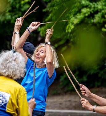 På parkens legeplads bliver en snoet forhøjning et perfekt udgangspunkt for balancetræning, og en cirkelformation giver gode rammer for en række øvelser, hvor deltagerne med pinde – af den naturlige og barkede slags – får rytme i deres bevægelser, når de slår dem mod hinanden og asfalten under dem.