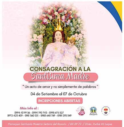 septiembre, y va hasta el 7 de octubre, día de nuestra Señora. La consagración a la Virgen Santísima y la petición de las vir tudes se está llevando a cabo por primera vez de manera grupal, y está teniendo muy buena aceptación por parte de toda la fe ligresía. Se creó un grupo a través del cual se hace un seguimiento diario, enviando las informaciones, las meditaciones y las oraciones.