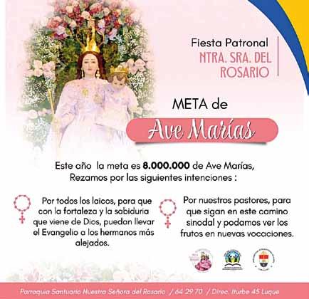 El 30 de agosto se lanzó oficial mente el reto de las Ave Marías en el que se tratará de alcanzar 8.000.000 de Ave Marías para Nuestra Madre del cielo, e invitamos a toda la familia luqueña a rezar el Santo Rosario y regalarle así millones de rosas a Nuestra Señora del Rosario.