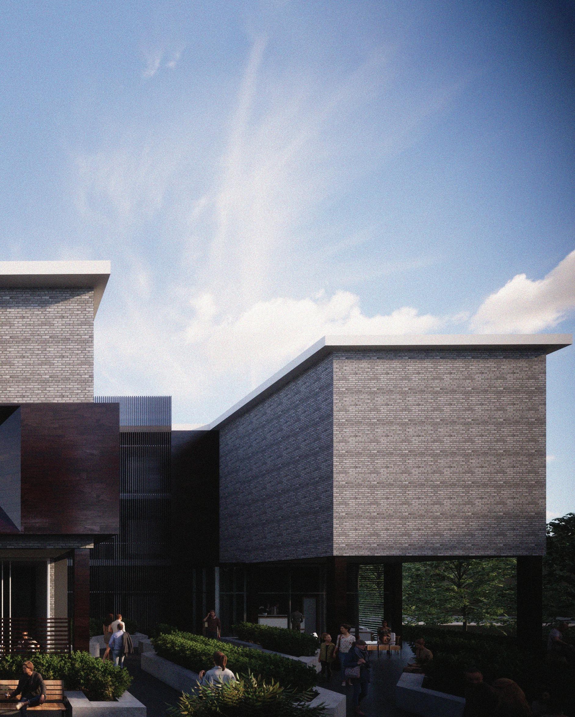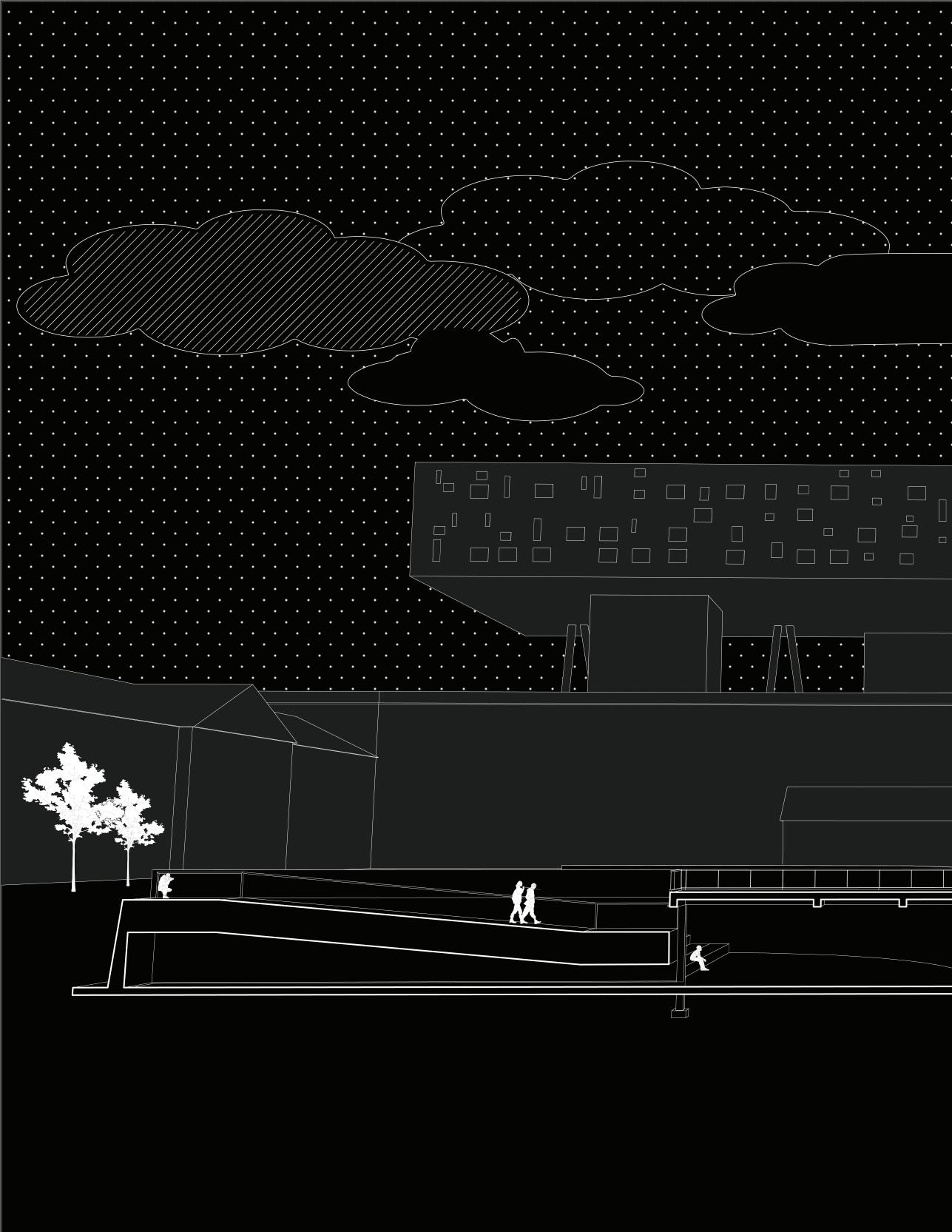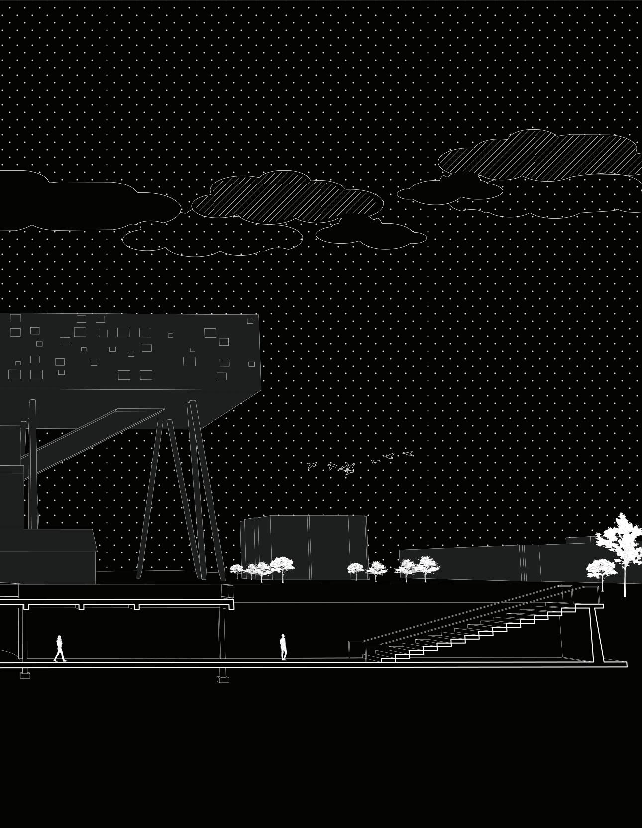In-between space bridging both heights. Represents both communities, existing residential and new developments, being bridged with the in-between space.