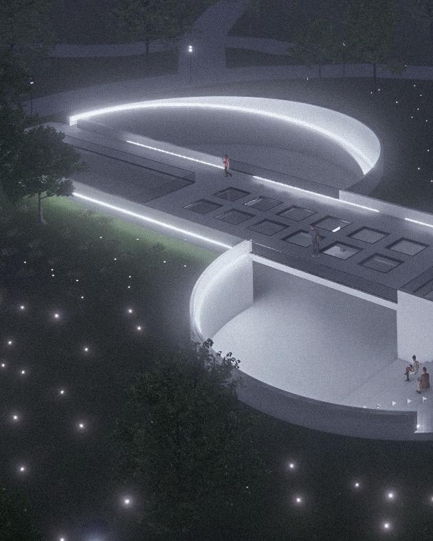 The pavilion design is intended to submerge the viewer into the realities of our society. An exhibit of resistance within the pavilion creates a somber and serious atmosphere while displaying resistance within the community. The light wells connect the viewer back to the environment above. The natural light is contrasted with the somber exhibit area and guides people to the ascending stairs, bringing them back to the city, with a view of the CN Tower. The surrounding presentation areas are social hubs that bring the community together and connect both levels of the pavilion to the community.