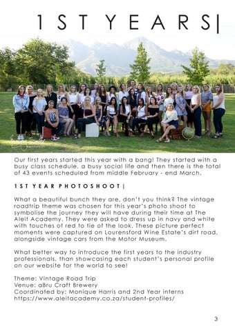 O ur f i r st ye ar s s tar te d th is y ear wit h a bang! They st art ed wi th a busy cl a ss sc h e d u le , a b u s y soc ial life and t hen t here is t he to tal of 43 e v e n t s s c h e d u le d f ro m mid d le February - end M arc h. 1 S T Y E A R P H O T O S H O O T | W ha t a be au t if u l b u n c h t h ey are, d on’ t you t hink? The v int age roadt r i p t h e m e w as c h o s e n for t his year’ s phot o shoot t o sy mb ol i se t h e jo u r n e y th e y will have d uring t heir t ime at The Aleit A ca de m y . T h e y w e re asked t o d ress up in nav y and wh i te with t o u c h e s o f re d to tie o f t he look. These pic t ure per fect mom e nt s w e re c ap t u re d o n Lourensford W ine Est at e’ s d irt ro ad, a l on g si de v in tag e c ar s f ro m t he M ot or M useum. W ha t be t t e r way to in tro d u ce t he first years t o t he ind ust ry prof e ssi o n als , t h an s h o w c asing eac h st ud ent ’ s personal pro f i l e on o u r w e b s ite f o r th e w o r ld t o see! T heme : V i nt ag e R o ad Tr ip Ven u e : a Br u C r af t B re we r y Coo rdi n a t e d b y : Mo n iq u e Harris and 2nd Year int er ns http s: / / w w w .ale it ac ad e m y . c o. z a/st ud ent -profiles/