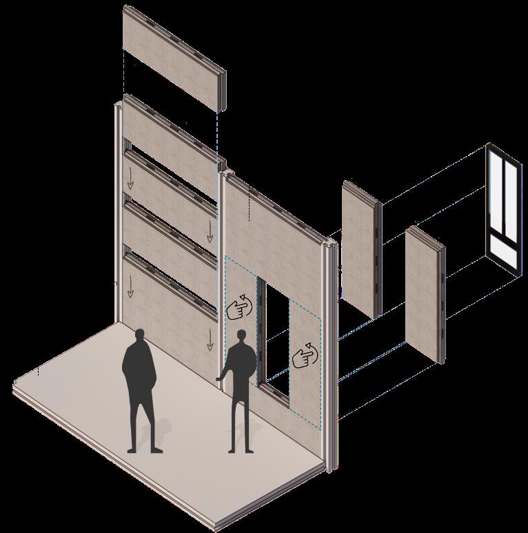 Dentro de las ventajas que posee implementar este sistema, cabe destacar la cantidad de modificaciones que puede implementarse en el diseño de este, puesto que es un sistema adaptable y flexible, permite modificar, intercambiar y adecuar los componentes y elementos que lo articulas, un ejemplo de esto son los acabados que pueden agregarse a los paneles verticales, da ndo una diferencia al resto de viviendas del mismo sistema, así mismo se propone que cada uno de estos paneles cuenten con una dimensiones que permitan su fácil coordinación y modulación como es el caso de la imagen inferior derecha, donde se muestra como el componente puede ser rotado y ocupar las dimisiones de dos paneles, concibiendo un ventanal en la fachada, dicho esto, queda claro que no es un sistema que únicamente tenga una proceso constrictivo, por el contrario este perime ser adaptado y modificar la fachada de la vivienda según las necesidades del usuario, sin embargo el panel original no cuenta con sistema que permita pasar la red de abastos, esto se da únicamente en comunas espaciales para cumpla con tal propósito, por este motivo se propone que cada panel vertical divisorio cuente con aberturas que conecten con las del panel inferior ye igualmente con el superior, teniendo como resultado un sistema que no interfiere en el sistema de abasteciendo de vivienda, proporciona mayor ventaja de creciente en el tiempo y/o expansiones.