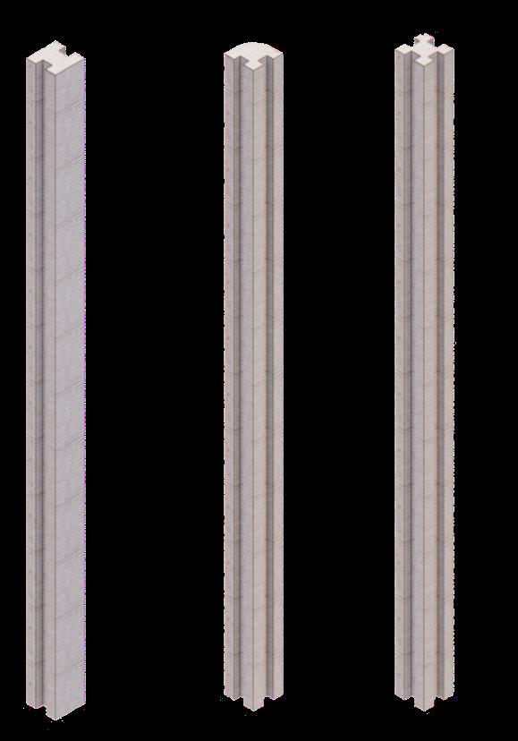 Para el desarrollo del sistema modular prefabricado se toma como referente el sistema Sandino, puesto que se conforma de un sistema mano portante y los panel es son de hormigón simple, en este caso se platea que los elementos verticales que articulan la fachada exterior este prefabricado a base de RCDs y las columnas de cemento reciclado pretensado. El cerramiento consta de hormigón armado monolítico se basa en paredes compuestas por pequeñas columnas de 12 x 12cm las cuales consta de 3 tipologías de acuerdo a la ubicación de las mismas, la primera columna se articula al sistema por medio de las fachadas exteriores en la cual hacia el exterior su cara es complet amente plana y solo cuenta con las ranuras en los laterales para ensamblar el panel, la columna esquinera como su nombre lo indica, se clasifica únicamente para las esquinas de la vivienda , uniendo los paneles, finalmente la columna central o intermedia e s la que cuenta con mayor cantidad de puntos de unión, esta se ubica principalmente al interior de la vivienda, permitiendo sostener y unir las separaciones interiores, de la variedad que este sistema permite, se decide únicamente contar con los tres componentes primordiales para cuantificar y construir una vivienda, puesto que uno de los principales propósitos es simplificar el proceso constructivo, siendo replicable y eficiente.