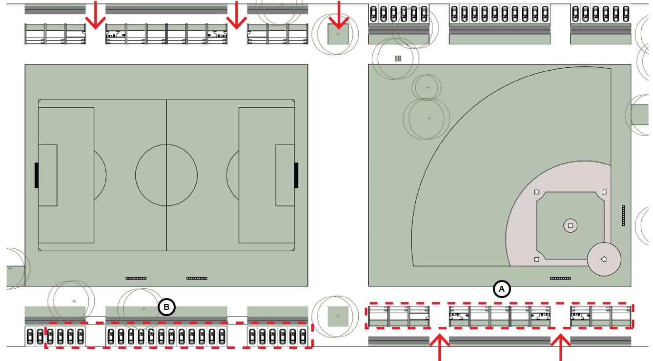 Access control is established by removing a module from the stands (A), framing the entrance. This approach allows the stands to function as a perimeter barrier that encloses the entire project. The stands are interspersed with parking bays (B), ensuring that vehicle spaces are integrated throughout the entire site