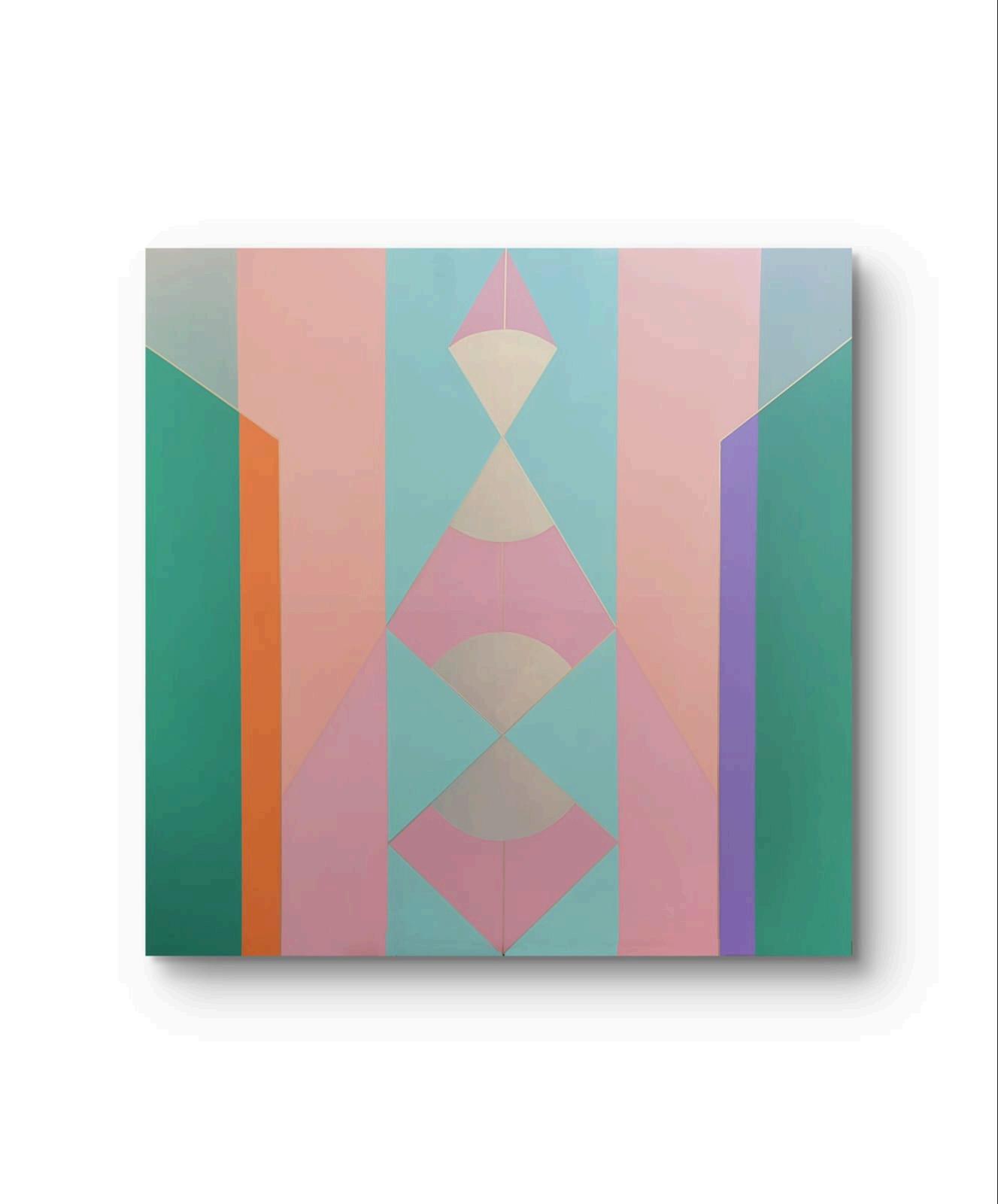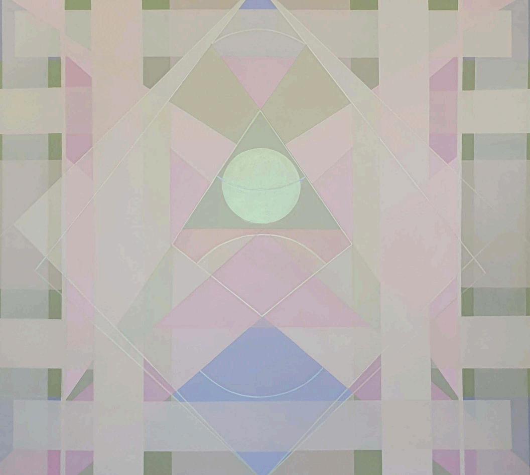 The triangle symbolizes the trinity of Being, representing the union of heaven and earth, and the connection between humanity and the sacredThe circle symbolizes infinity, while the square is the primordial form of human creation Colour is used symbolically, with complementary opposites in a desaturated palette, accompanied by transparencies and glazes that create an ethereal space Gold, present in the communicating lines and circles, is a clear allusion to alchemy