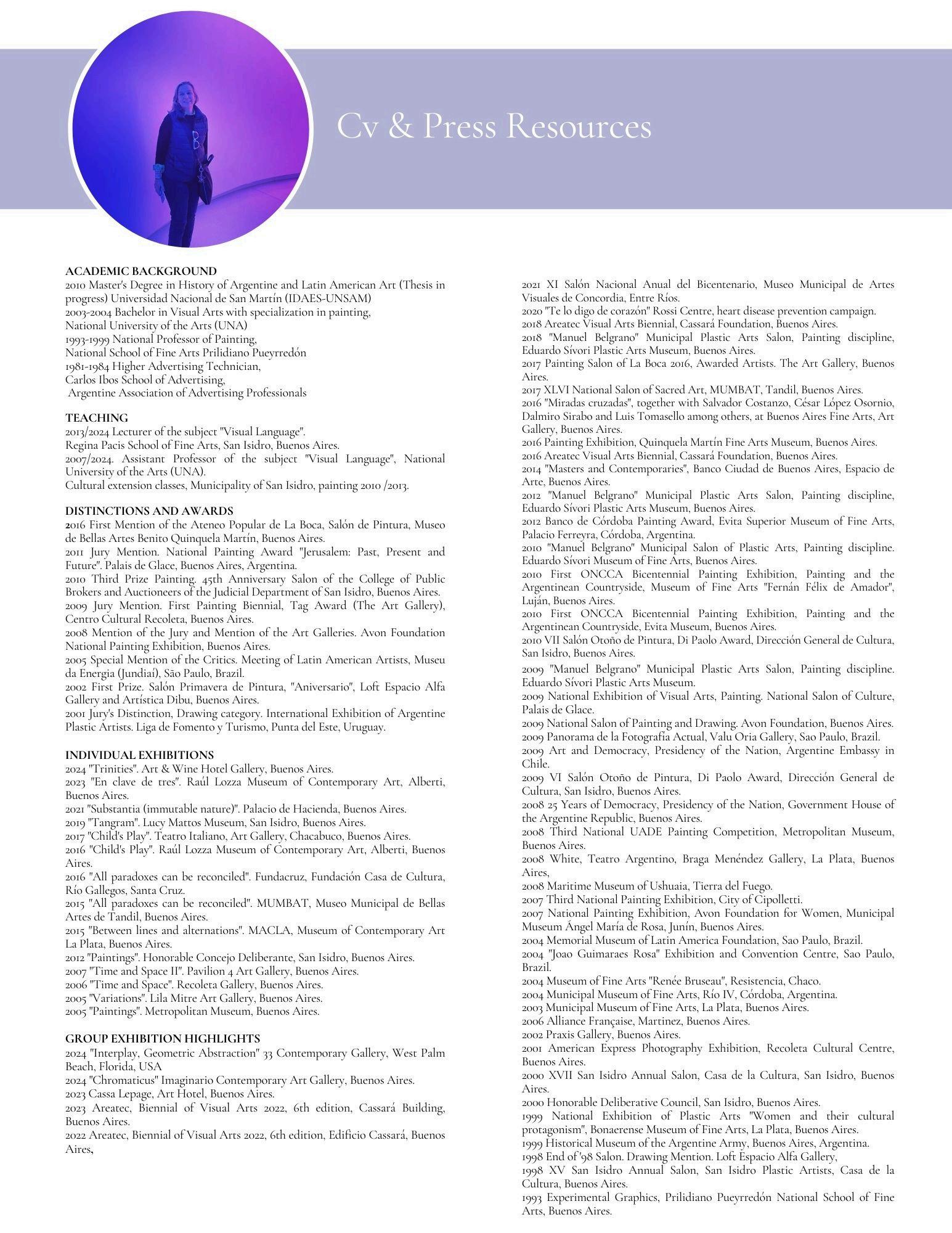 She has participated in numerous exhibitions and awards, such as the Salón Nacional de Artes Visuales, the Salón Municipal, the Premio Sívori, the Premio UADE, the Banco de Córdoba and the Premio Avon Among her distinctions are the First Mention at the Painting Salon of the Ateneo Popular de La Boca, the National Painting Prize "Jerusalem: past, present and future" at the Palais de Glace in Buenos Aires, the Critics' Prize and the Art Galleries Prize at the National Painting Salon of the Avon Foundation She has exhibited individually at the Museo de Arte Contemporáneo Raúl Lozza, the Museo Municipal de Bellas Artes de Tandil and the Museo de Arte Contemporáneo La Plata, Her work is present in public and private collections