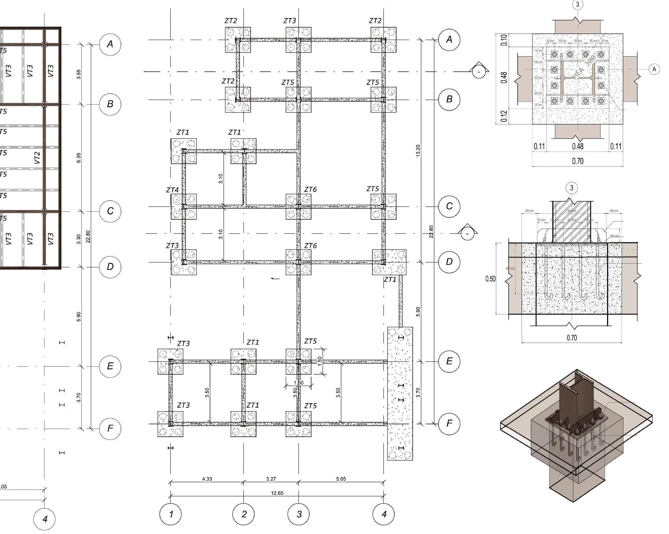 Estructura metalica con pefilería IPE y tipo C manejando luces de 5m y 7,5m que permiten en el sotano distribuir los parquederos con las medidas requeridas segun la norma. El sistema aporticado tranfiere las cargas a la placa flotante que funciona como cimentación para un edificio de 5 pisos.
