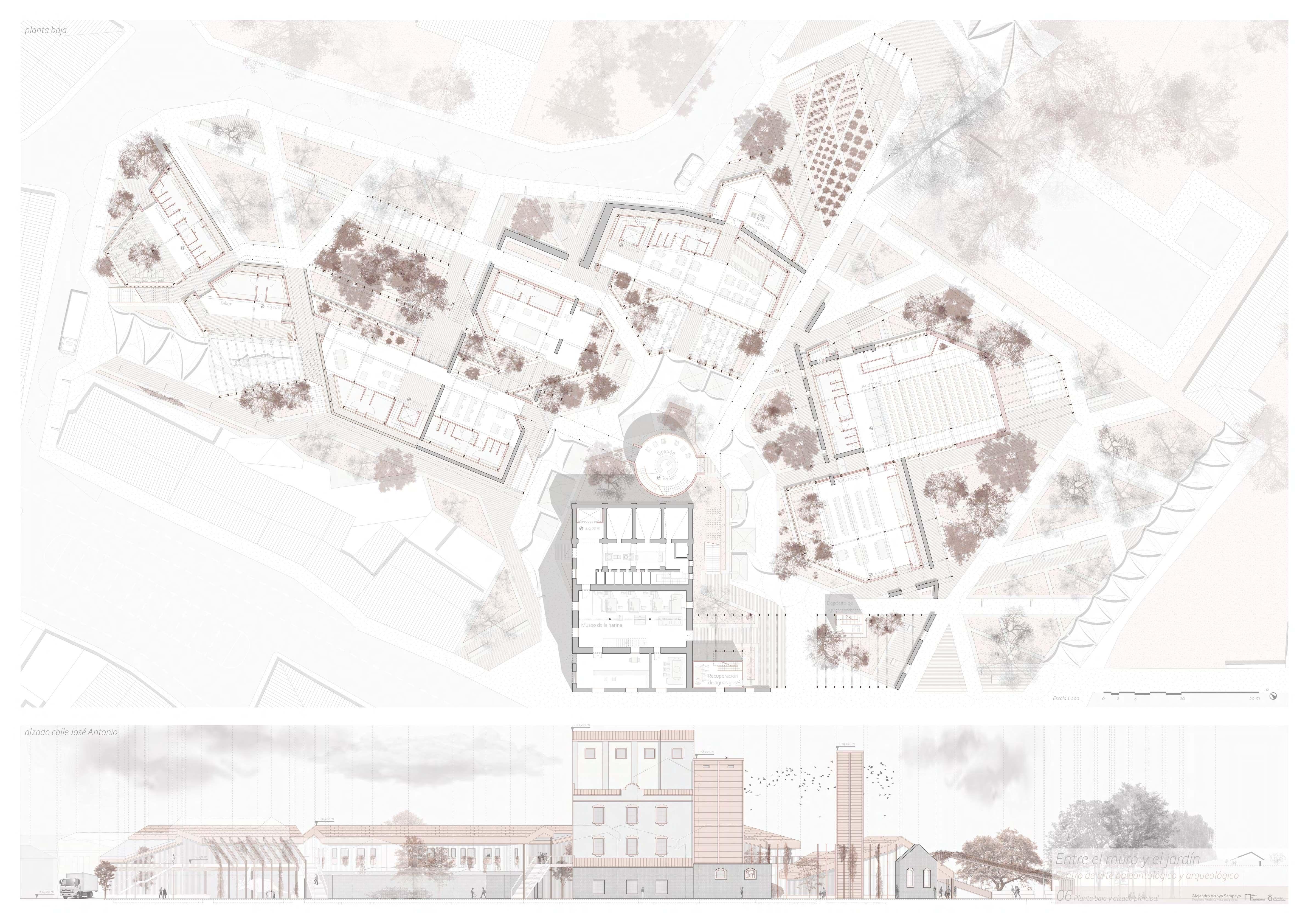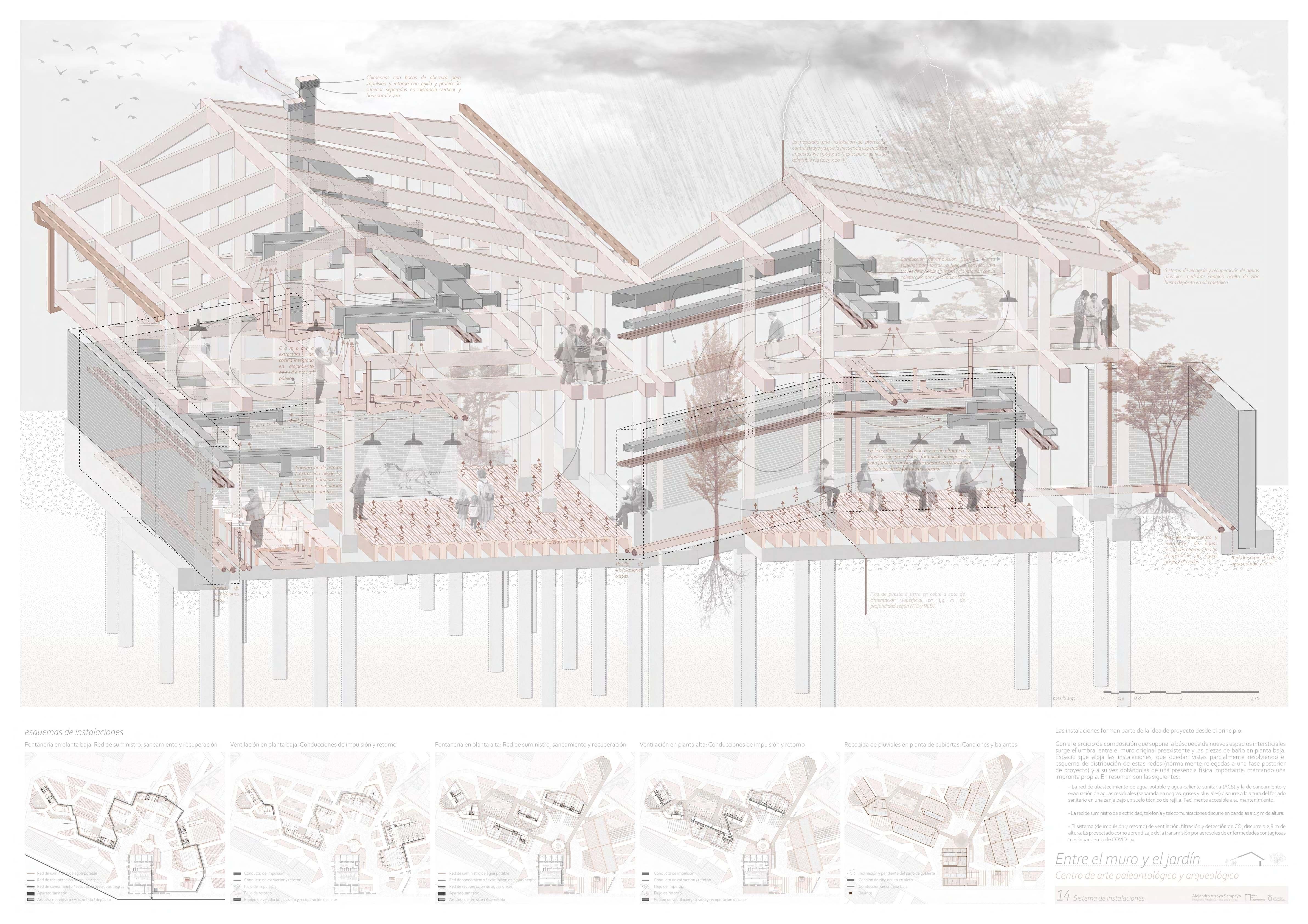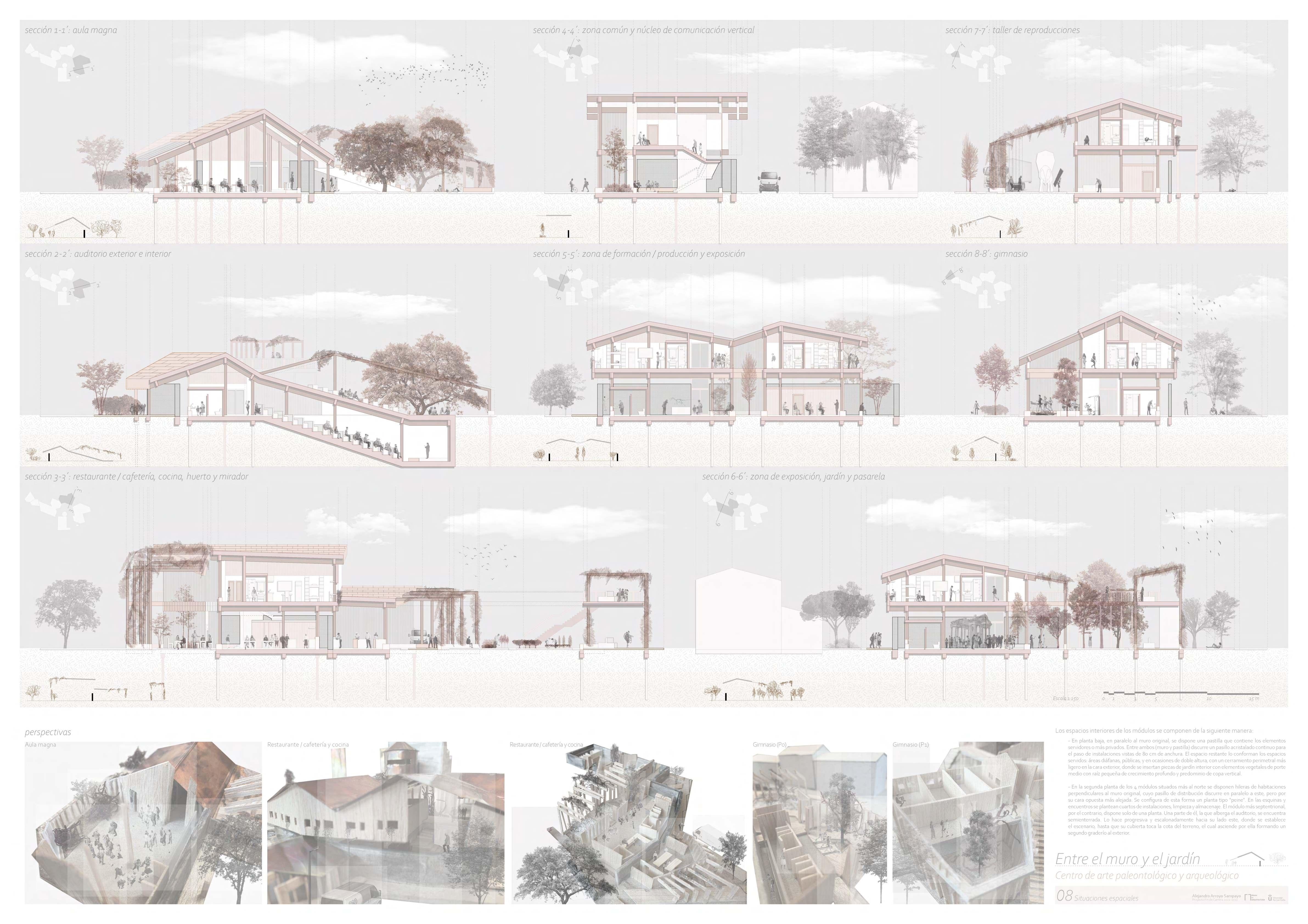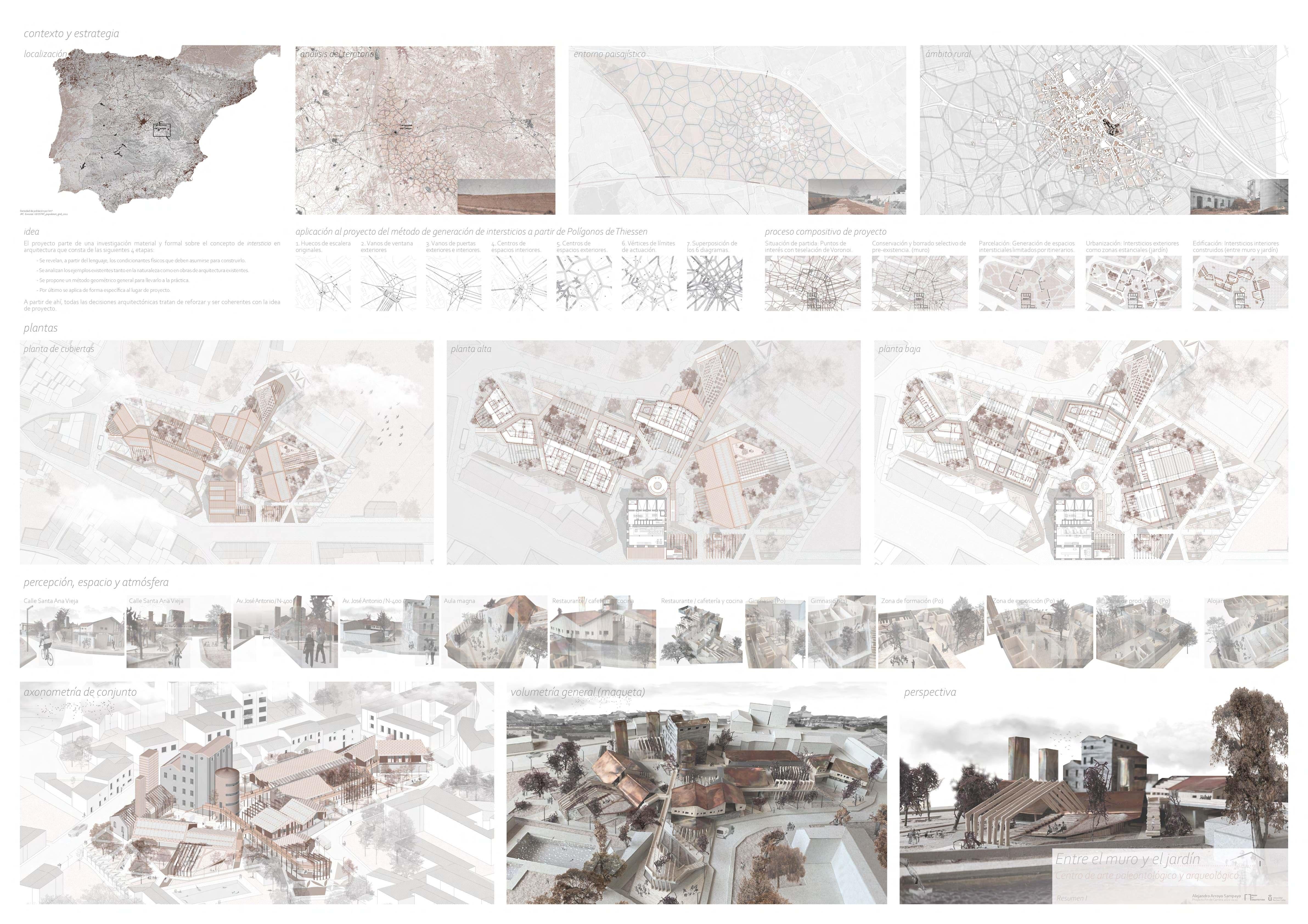 Su resolución parte de algo tan abstracto como una investigación formal sobre el concepto de intersticio en arquitectura que, llevada al extremo, termina decantando en algo tan concreto como una colección de situaciones espaciales entre un muro y un jardín... y, además, con dinosaurios, por supuesto.